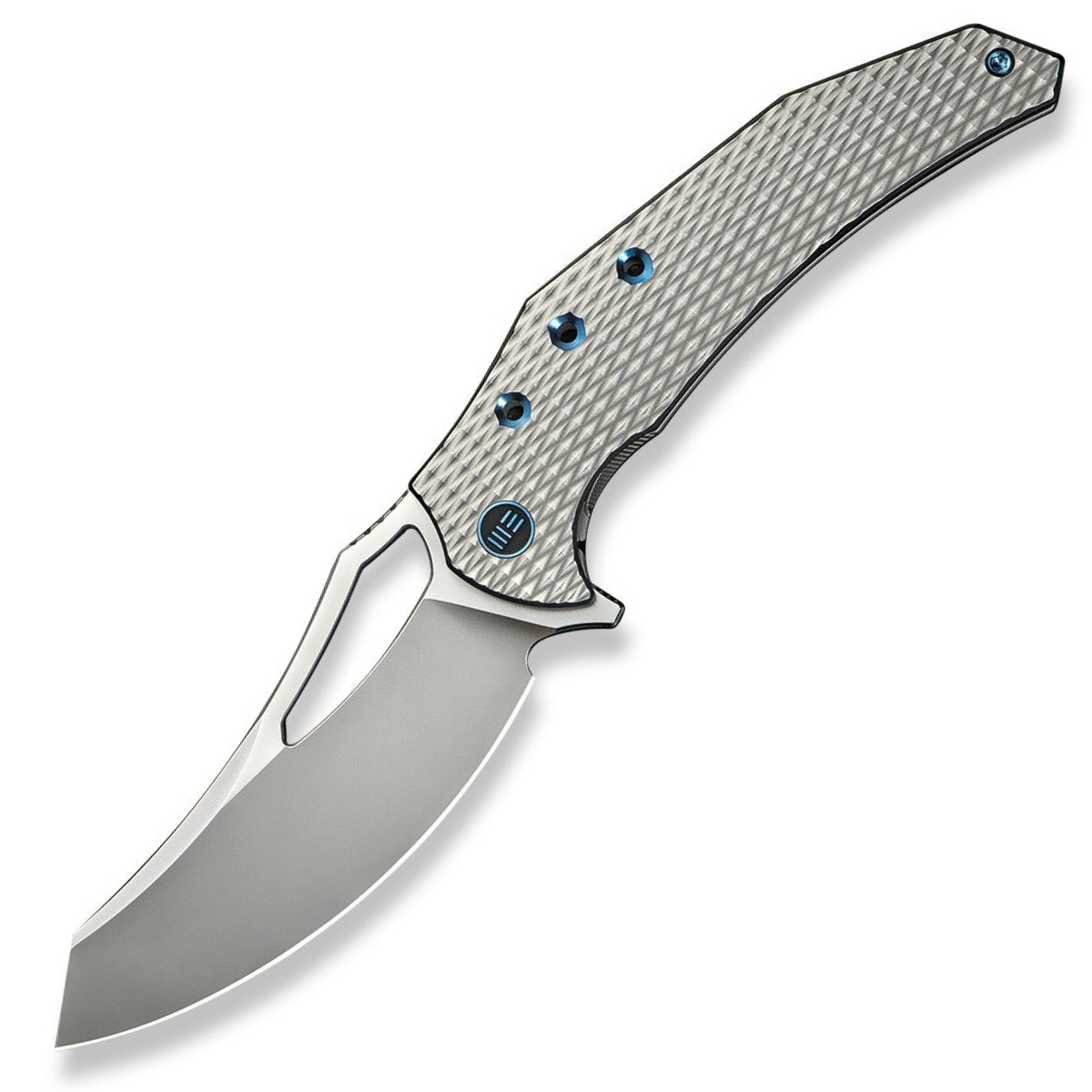 Rękojeść - z tytanu 6AL4V, fazowane krawędzie okładek eliminują ostre krawędzie. W całości pokryta teksturą w kształcie diamentu, zwiększającą pewność chwytu. Otwarta konstrukcja tzw. open-backed mocowana tytanowymi tulejami dystansowymi redukuję wagę oraz ułatwia czyszczenie. Oś pivota zdobi stylizowane logo marki WE Knife. Głębokie podcięcie na palec (fore finger groove) poprawia pewność uchwytu. Jednopozycyjny (prawa) tytanowy klips deep carry pozwala przenosić dyskretnie nóż w kieszeni w pozycji tip-up (czubkiem ostrza do góry).