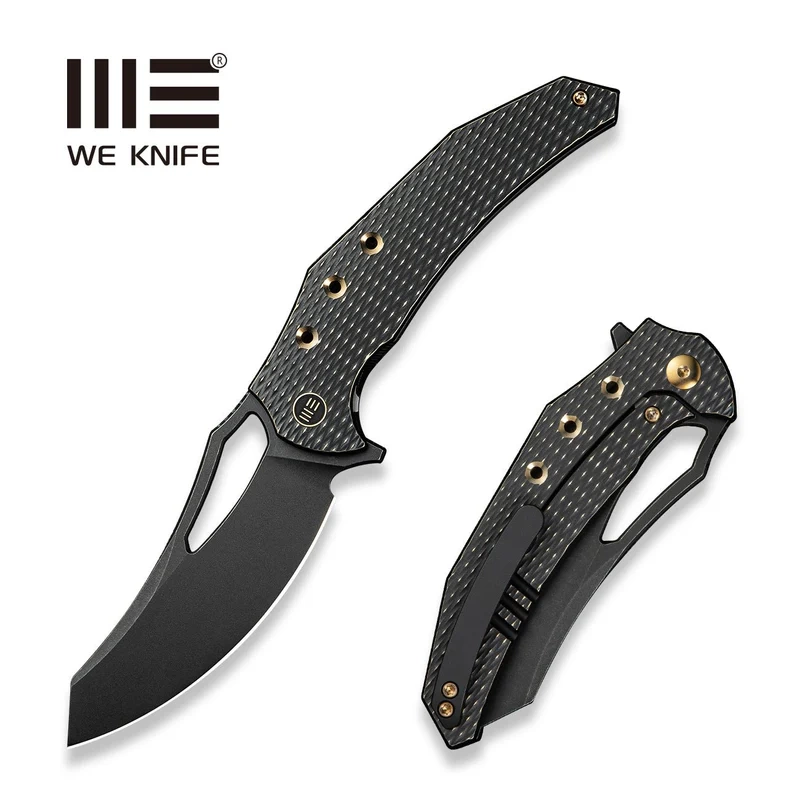 Rękojeść - z tytanu 6AL4V, fazowane krawędzie okładek eliminują ostre krawędzie. W całości pokryta teksturą w kształcie diamentu, zwiększającą pewność chwytu. Otwarta konstrukcja tzw. open-backed mocowana tytanowymi tulejami dystansowymi redukuję wagę oraz ułatwia czyszczenie. Oś pivota zdobi stylizowane logo marki WE Knife. Głębokie podcięcie na palec (fore finger groove) poprawia pewność uchwytu. Jednopozycyjny (prawa) tytanowy klips deep carry pozwala przenosić dyskretnie nóż w kieszeni w pozycji tip-up (czubkiem ostrza do góry).