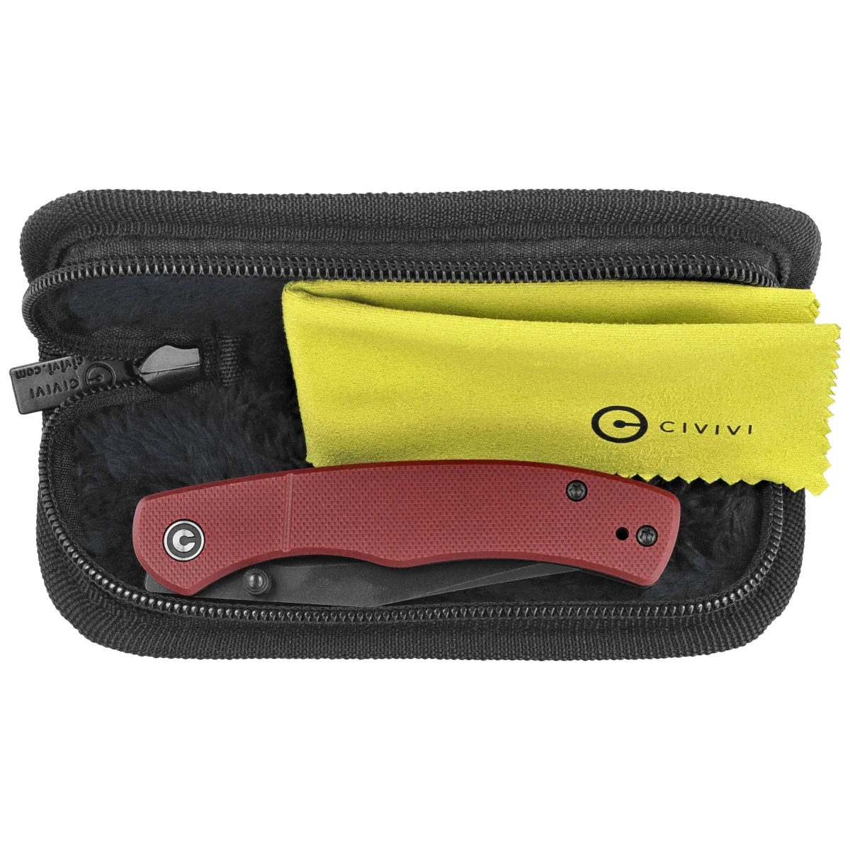 Rękojeść - szorstkie okładziny z kompozytu G10, praktycznie niezniszczalnego tworzywa niewrażliwego na warunki atmosferyczne, odpornego na chemikalia i uszkodzenia mechaniczne, które zostały przykręcone do stalowych linersów. Otwarta konstrukcja tzw. open-backed mocowana stalowymi tulejami dystansowymi redukuję wagę oraz ułatwia czyszczenie. Prosta, pewna konstrukcja daje pewność wieloletniego użytkowania. Klips typu deep carry, dwupozycyjny (prawo/lewo), umożliwia przenoszenie noża w pozycji tip-up (czubkiem do góry). Oś pivota zdobi stylizowane logo marki Civivi.