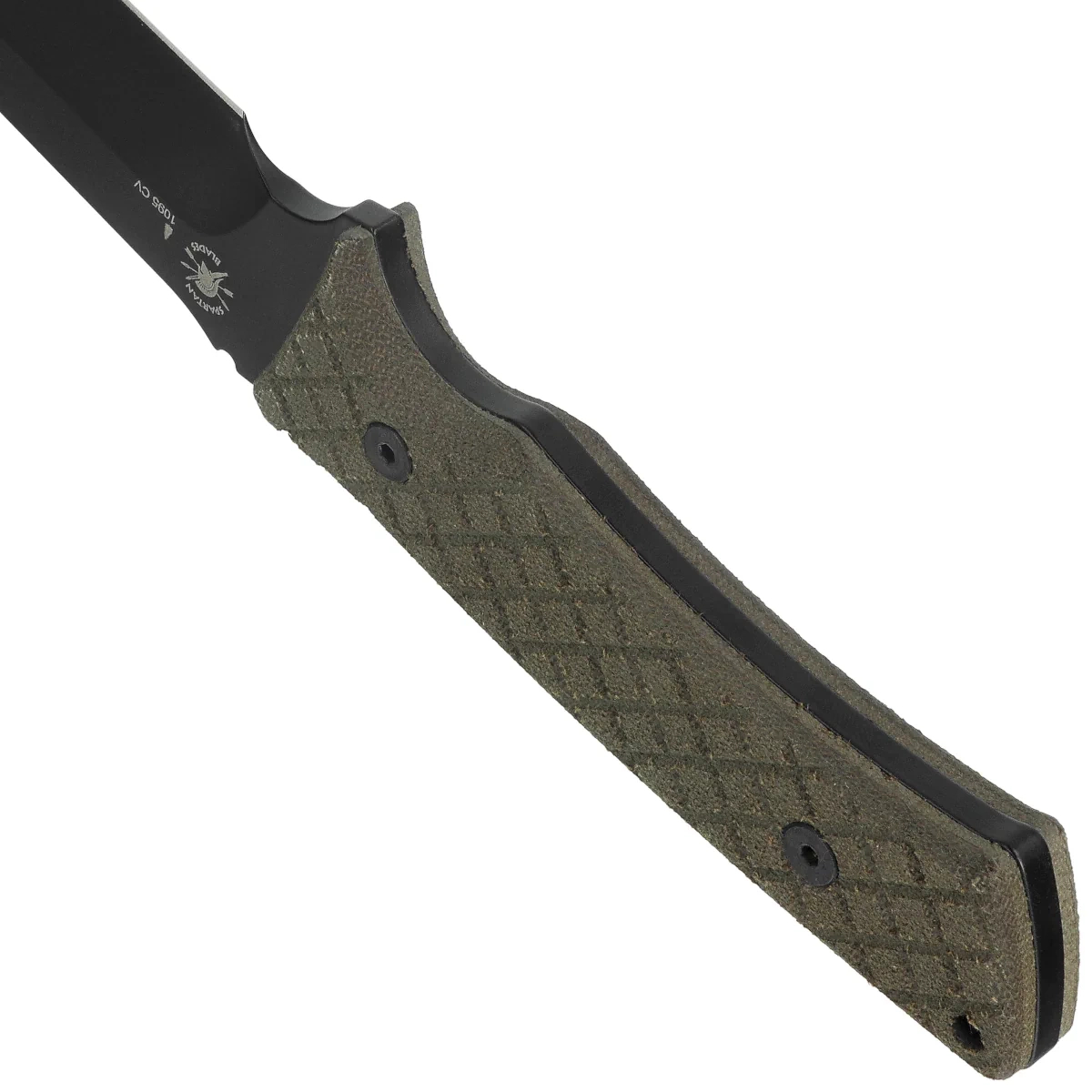 Rękojeść - okładziny z kompozytu Canvas Micarta, praktycznie niezniszczalnego tworzywa niewrażliwego na warunki atmosferyczne, odpornego na chemikalia i uszkodzenia mechaniczne. Profilowany kształt i precyzyjne teksturowanie zapewnia wygodny, pewny uchwyt również wilgotnymi dłońmi. Wykonane z przodu podcięcie na palce (fore finger groove) dla poprawienia pewności uchwytu. Rozszerzenie w przedniej części tworzy mini gardę zapobiegającą przypadkowemu zsunięciu się dłoni na ostrze.
