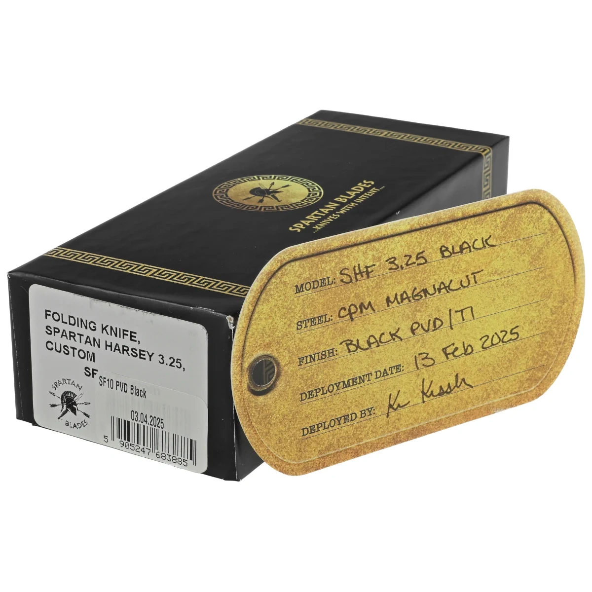 Spartan Harsey Folder 3.25 Black PVD Titanium, Gray HW, Stonewashed. "Spartan Harsey Folder 3.25" lub "SHF 3.25" to precyzyjnie wykonany nóż składany, stworzony według autorskiego projektu słynnego mistrza nożownictwa - Billa Harseya. Materiały premium w połączeniu z precyzyjnym dopasowaniem i wykończeniem Spartan Blades sprawiają, że jest to wytrzymały, łatwy w użyciu EDC. Ostrze z ekskluzywnej stali MagnaCut, charakteryzującej się wyjątkową odpornością na korozję oraz ponadprzeciętną ostrością.  Rękojeść wykonana została z lekkiego, anodyzowanego na czarno tytanu o matowej fakturze, co zapewnia komfortowy i pewny chwyt nawet mokrą dłonią. Kształt uchwytu zaprojektowano z myślą o anatomii dłoni użytkownika, gwarantując wygodę oraz stabilność podczas precyzyjnych czynności. Bezpieczeństwo użytkowania zapewnia solidna blokada typu frame lock, uniemożliwiająca przypadkowe złożenie ostrza w trakcie pracy. Spartan Harsey Folder 3.25 doceniany jest przez miłośników dyskretnych i niezawodnych narzędzi klasy premium.
