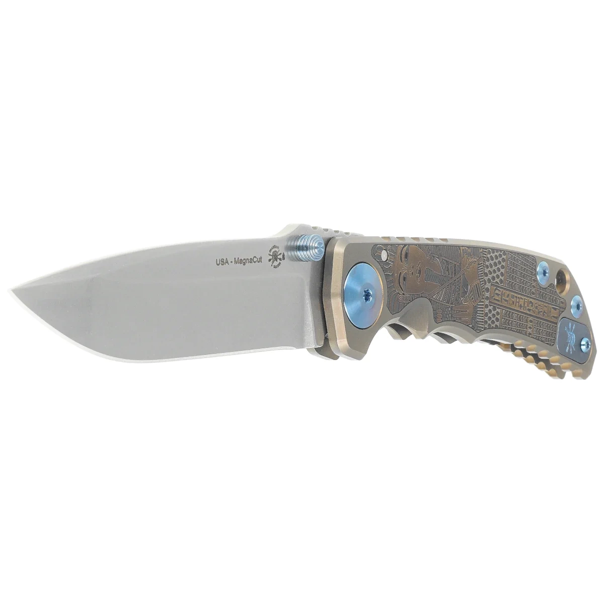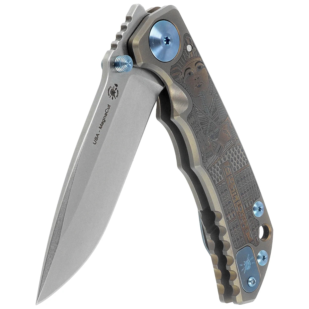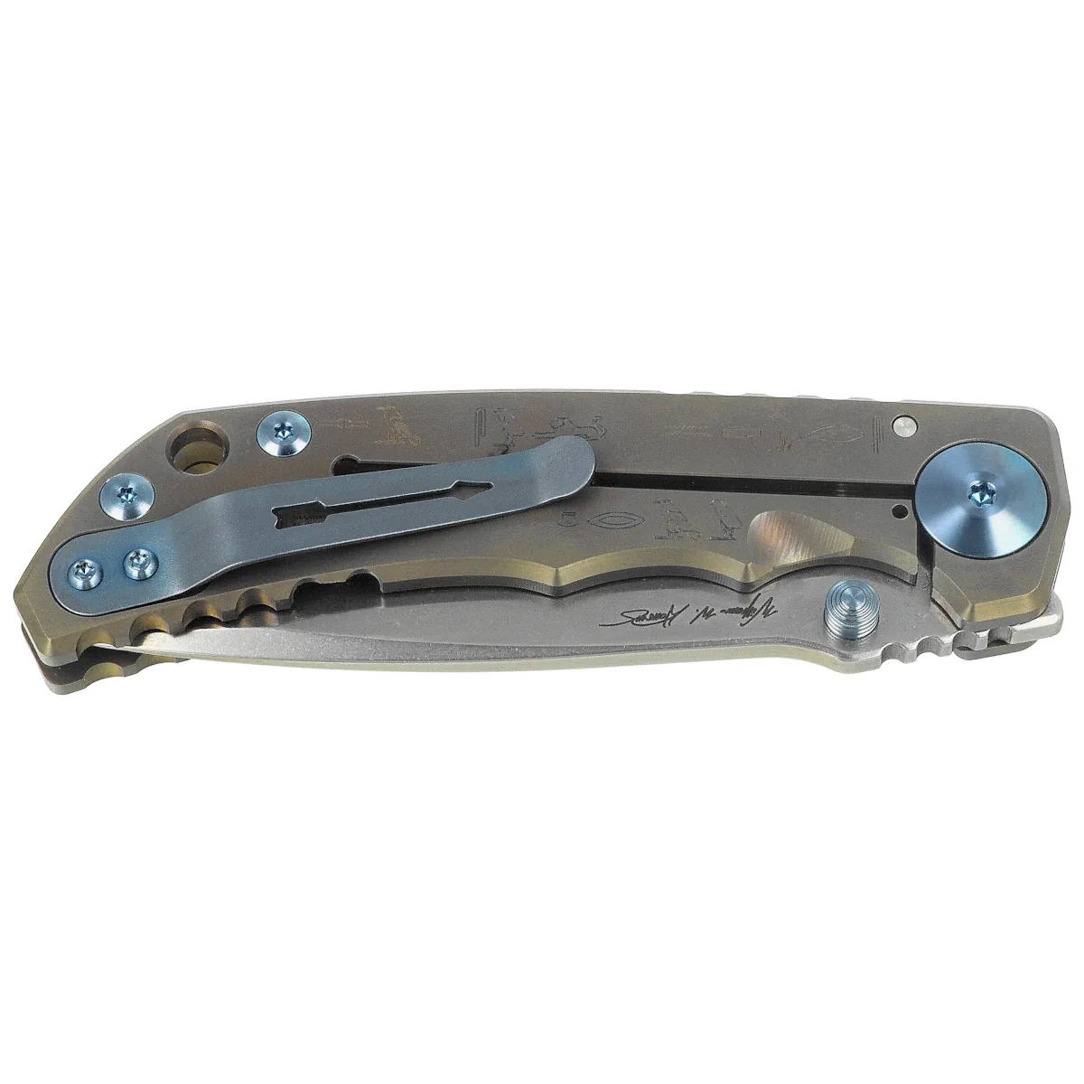 Solidna rękojeść z tytanu ozdobiona jest artystycznym grawerunkiem, przedstawiającym motyw egipskiego faraona Tutanchamona. Całość uzupełniają anodowane na niebiesko detale, które efektownie kontrastują z brązowym odcieniem rękojeści. Dzięki odpowiednio wyprofilowanemu uchwytowi nóż pewnie leży w dłoni, zapewniając precyzję podczas wykonywania różnorodnych działań. Solidny mechanizm blokujący typu frame lock gwarantuje bezpieczne użytkowanie nawet w ekstremalnych warunkach. Każdy egzemplarz jest wykonywany ręcznie w USA, co czyni go wartościowym i poszukiwanym przedmiotem zarówno wśród kolekcjonerów, jak i wymagających użytkowników.