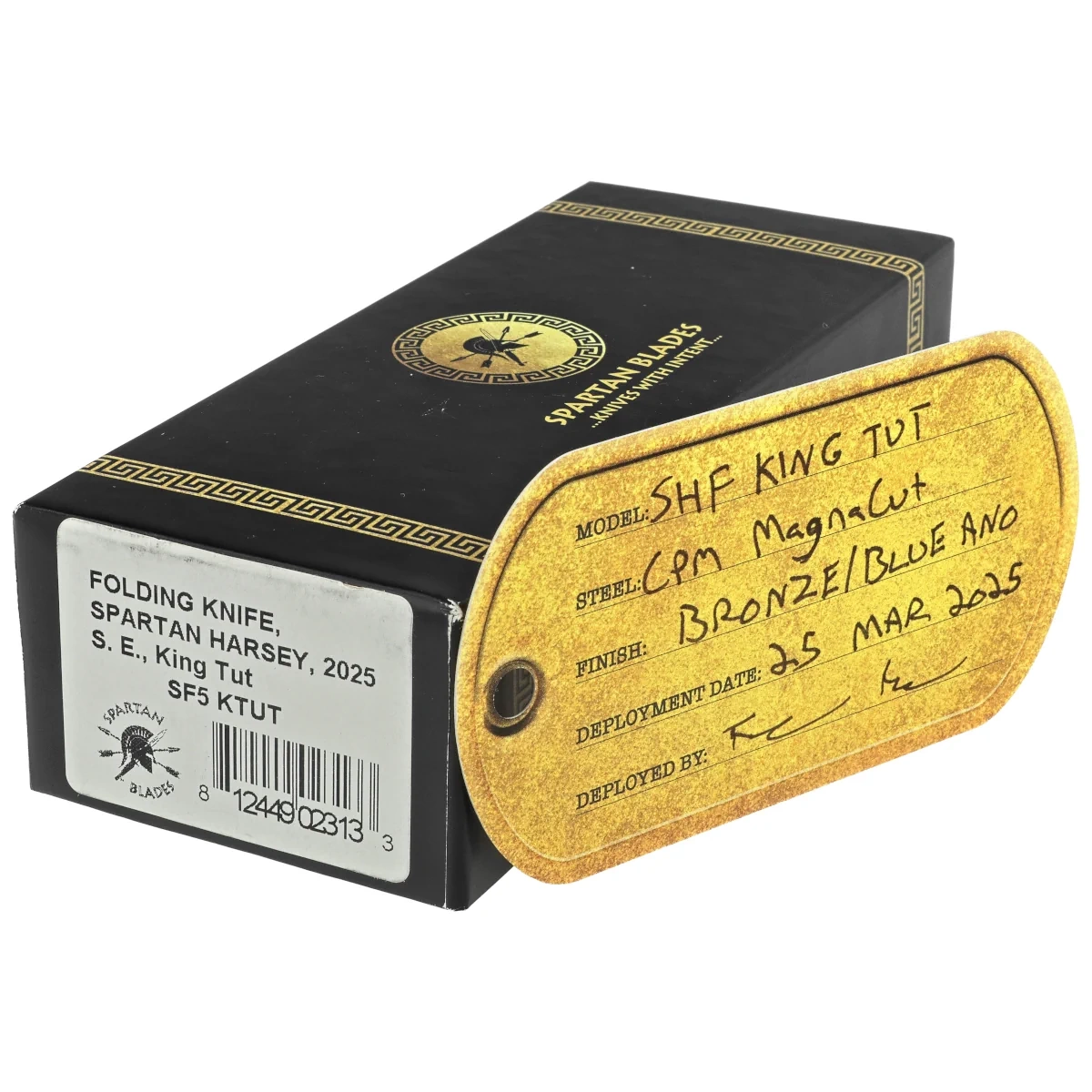 Spartan Harsey Folder Special Edition "King Tut" Bronze/Blue Ano Titanium, Blue HW, Stonewashed. "Spartan Harsey Folder" lub "SHF" uznawany jest za arcydzieło wśród noży taktycznych. Zaprojektowany przez legendę knifemakingu, Billa Harseya, został wyprodukowany w limitowanej serii. Zdobywca nagrody American Made Knife of The Year 2016 na targach nożowych Blade Show w Atlancie.