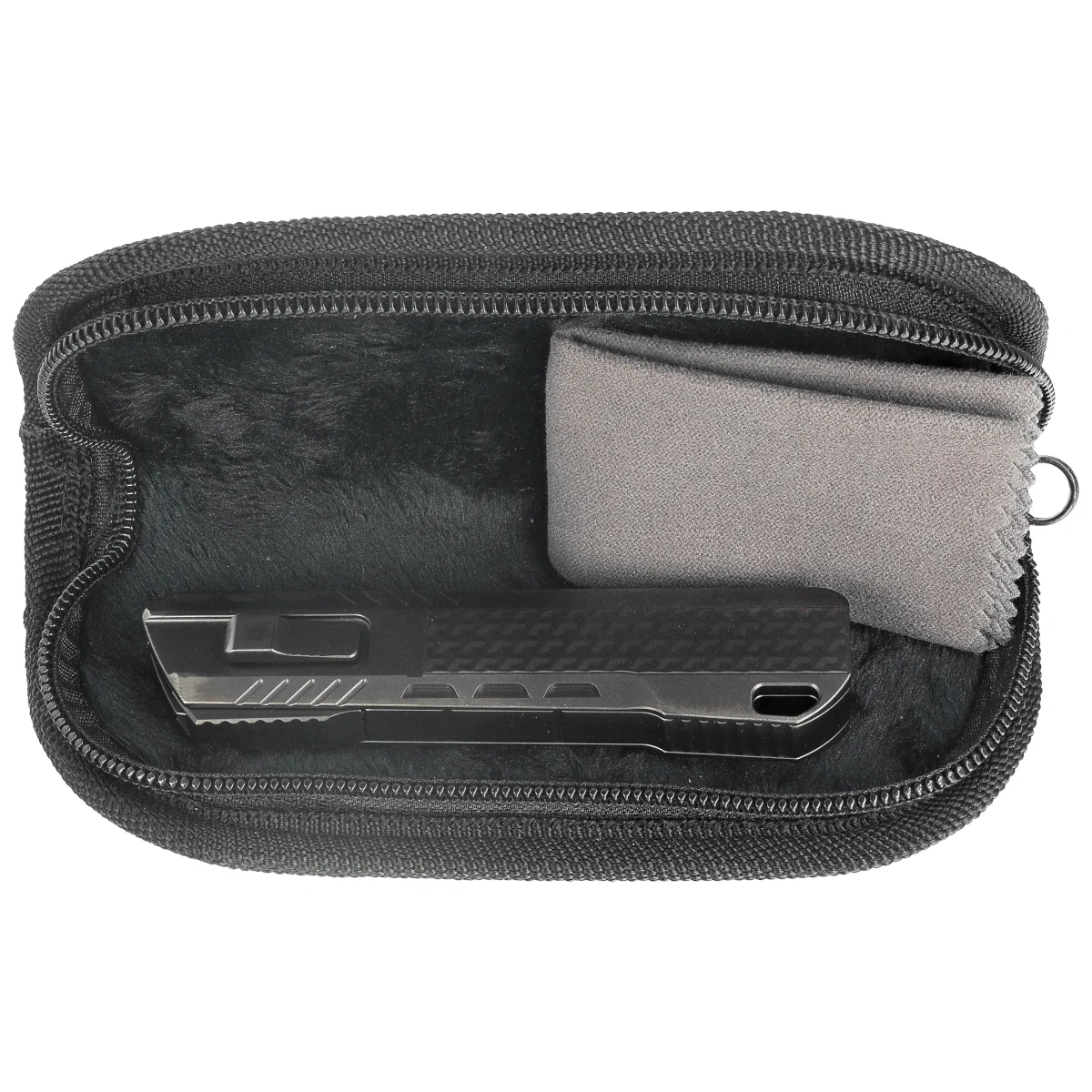 Rękojeść - wykonana na frezarkach CNC z tytanu również pokrytego czarną powłoką DLC. Fazowane krawędzie okładek z trójwymiarową teksturą eliminują ostre ranty oraz poprawiają pewność uchwytu. Po prawej stronie kunsztowny suwak do wysuwania/wsuwania klingi. Jednopozycyjny tytanowy (prawa) klips deep carry umożliwia dyskretne przenoszenie noża w kieszeni w pozycji tip-down (czubkiem ostrza do dołu).