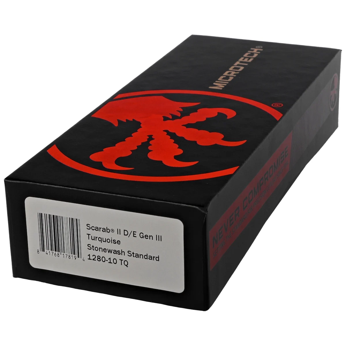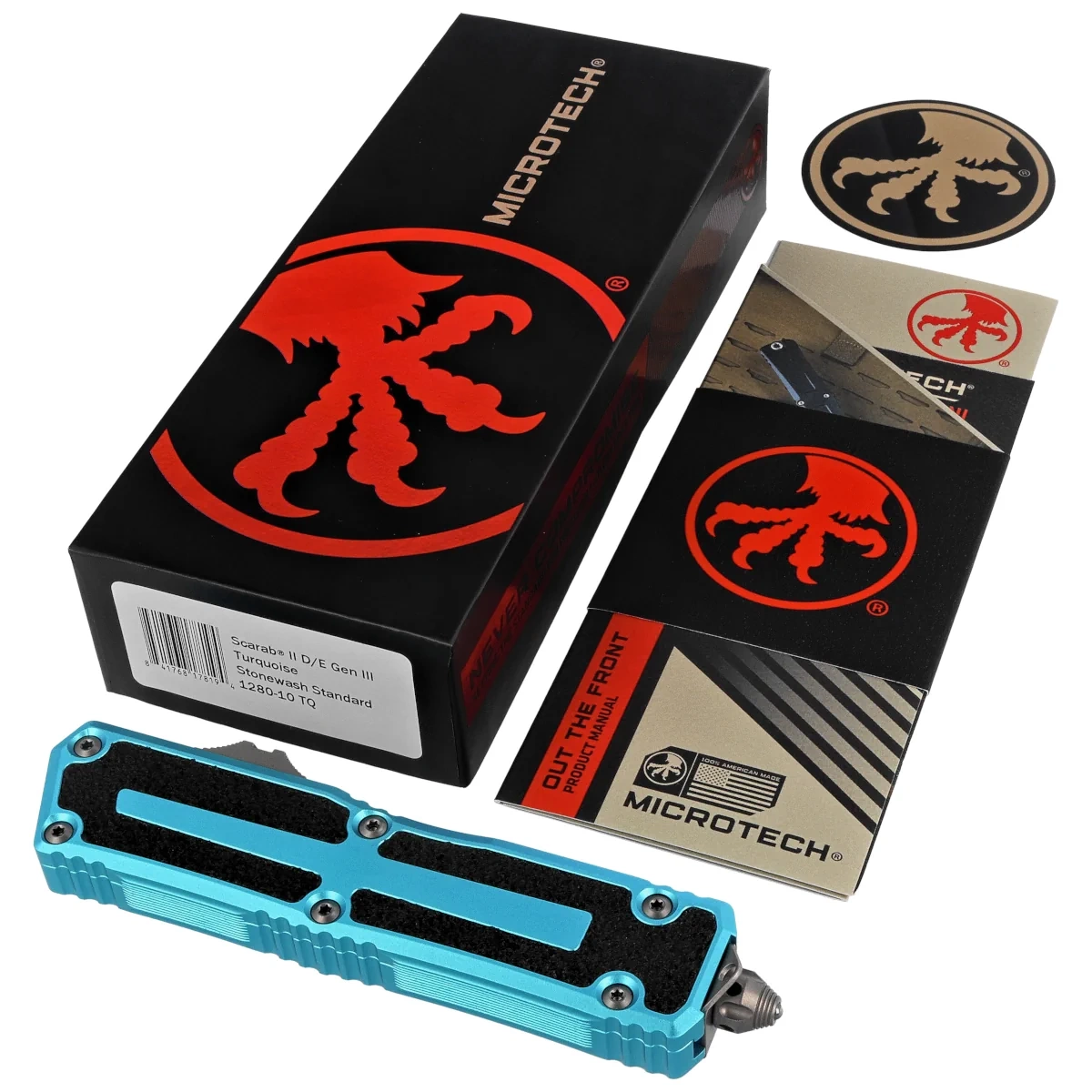 Scarab II Gen III D/E Turquoise Aluminium/3M, Stonewashed to szczyt doskonałości w dziedzinie automatycznych noży taktycznych, czerpiący inspirację z oryginalnego projektu Microtech Ultratech. Zbudowany, aby wytrzymać najtrudniejsze warunki, nowy Scarab II jest najlepszym wyborem do intensywnego użytkowania. Zachowując cechy stylistyczne swojego poprzednika, wyznacza nowy standard dla technologii OTF (Out The Front).