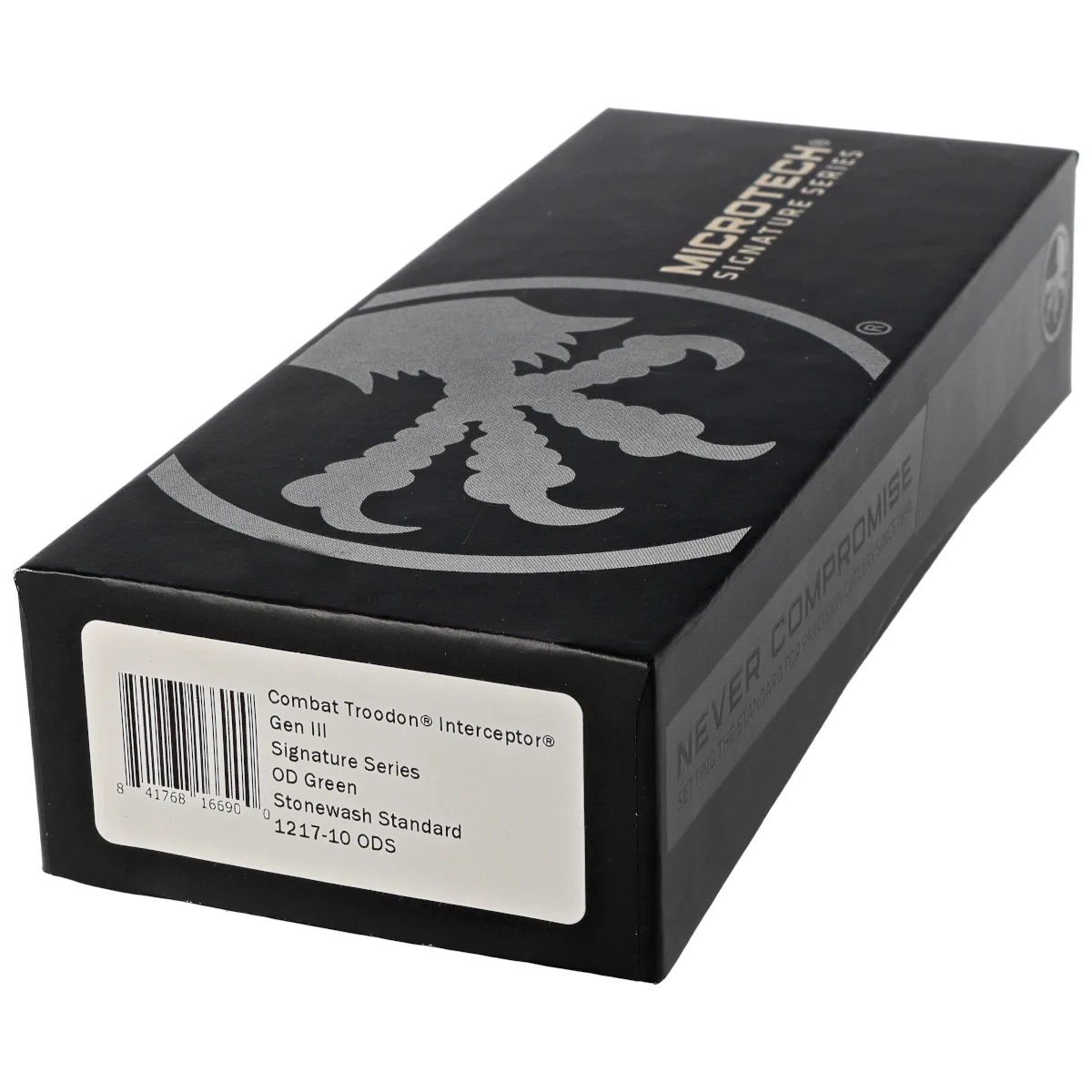 Combat Troodon Gen III Interceptor Signature OD Green Aluminium, Stonewashed ten największy z noży automatycznych, to szczyt precyzyjnej inżynierii i taktycznej sprawności w dziedzinie noży OTF (Out The Front). Zbudowany z myślą o szerokim spektrum zastosowań użytkowych, może pochwalić się większym o 25% rozmiarem w porównaniu do flagowego Troodona. Precyzyjnie wykonany, wyposażony w wyrafinowany i piekielnie szybki mechanizm wysuwający ostre jak brzytwa ostrze nowego typu - Interceptor. W 100% wyprodukowany i zmontowany w USA. Projekt Anthony'ego Marfione, knifemakera i właściciela Microtech Knives.