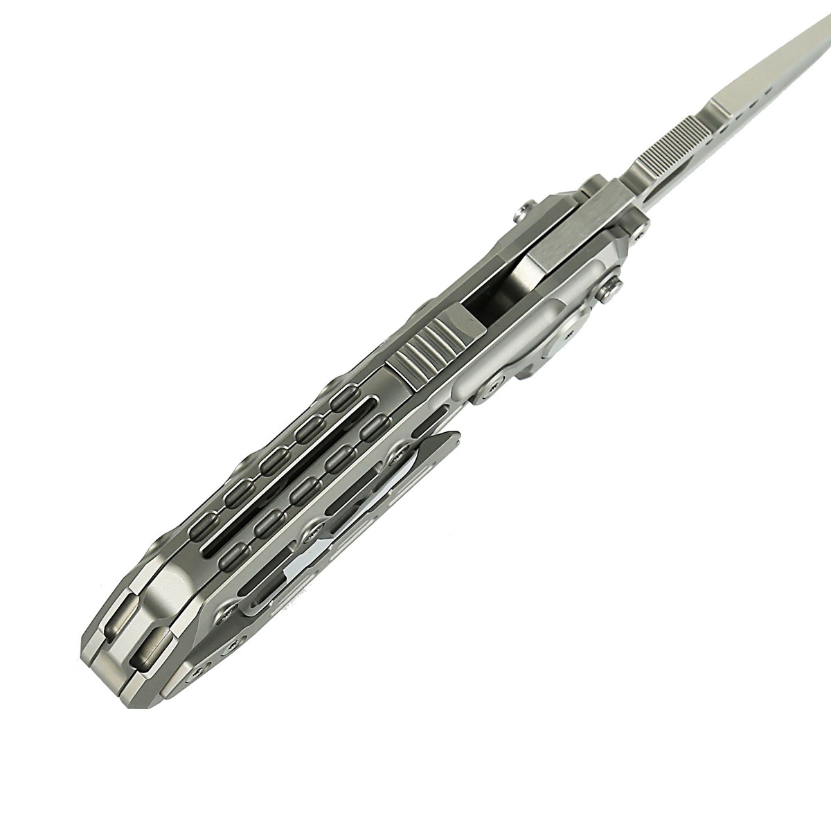 Rękojeść - z litego tytanu 6AL4V, perfekcyjnie wyfrezowana na obrabiarkach numerycznych CNC. Konturowanie okładek eliminuje ostre krawędzie, a ażurowana powierzchnia poprawia pewność chwytu. Tylko nieliczne firmy są w stanie wykonać rękojeść z tak nieprawdopodobną dokładnością! Okładziny połączono ze sobą przy pomocy tytanowego backspaceraKlips jednopozycyjny (prawa), z tytanu, umożliwia przenoszenie noża w pozycji tip-up. Na grzbiecie suwak zwalniania dodatkowej blokady w postaci dwóch stalowych walców umieszczonych nad osią pivota. Blokada działa również, gdy nóż jest zamknięty, zapobiegając przypadkowemu otwarciu. Wystający fragment backspacera może być używany jako improwizowany zbijak do szyb, posiada również otwór na linkę zabezpieczająca lub ozdobną.