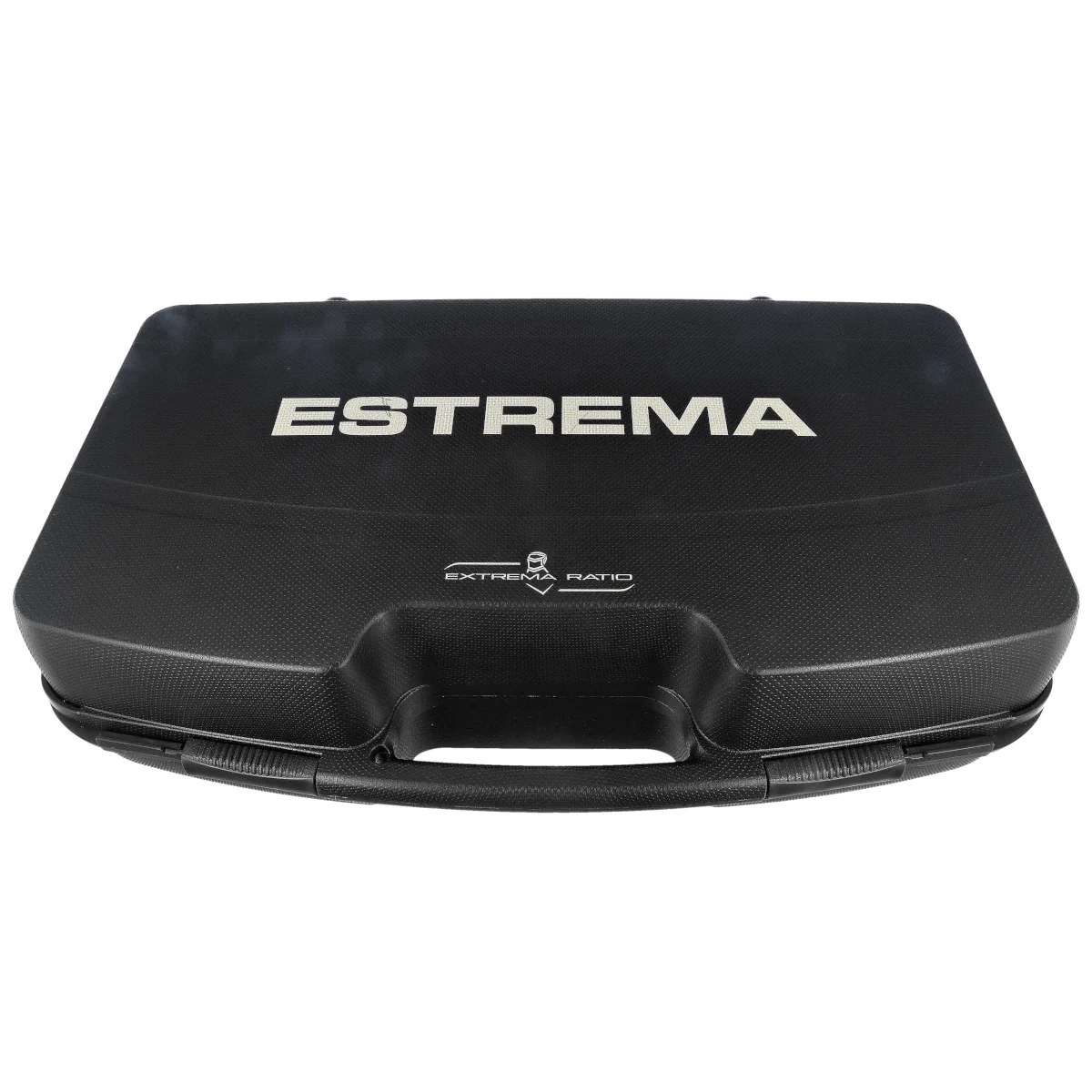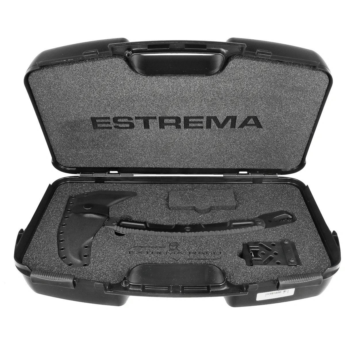 Rękojeść - okładziny wykonano z G10 – kompozytu zapewniającego doskonałą wytrzymałość mechaniczną i odporność na skrajne temperatury, wilgoć oraz środki chemiczne. Materiał ten gwarantuje niezawodność zarówno w suchym piasku, jak i w intensywnym deszczu czy śniegu. Dzięki dwupozycyjnej geometrii uchwytu, użytkownik może operować narzędziem zarówno w sposób siłowy, jak i precyzyjny. Tradycyjny uchwyt umożliwia silne uderzenia, przedni zapewniaja większą kontrolę w ciasnych przestrzeniach. Teksturowana powierzchnia poprawia przyczepność, a dopracowane kształty zmniejszają zmęczenie dłoni podczas długiej pracy. Dodatkowo, zwężający się koniec rękojeści może służyć jako narzędzie do podważania, cięcia blach czy forsowania wejść, co zwiększa funkcjonalność toporka. Estrema może być doposażona w modułowy młotek ze stali węglowej (brak w zestawie podstawowym), montowany poprzez system sprężynowy z zabezpieczeniem.