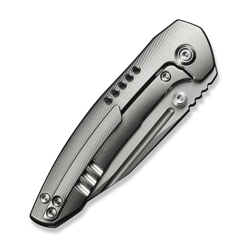 Rękojeść - z satynowanego i polerowanego tytanu 6AL4V, łącząca wytrzymałość i lekkość w jednej konstrukcji. Precyzyjnie frezowane okładziny zapewniają naturalne dopasowanie do dłoni, gwarantując komfortowy i stabilny chwyt nawet podczas dłuższego użytkowania. Teksturowana powierzchnia poprawia przyczepność, a otwarta konstrukcja szkieletu ułatwia konserwację. Wewnętrzne komponenty – backspacer, thumb stud, pivot cap i śruby – również wykonano z tytanu 6AL4V, co podkreśla spójność stylistyczną i trwałość całości. Nóż wyposażono w jednopozycyjny (prawa) klips tip-up, umożliwiający dyskretne i bezpieczne przenoszenie. Ceramiczne łożyska kulkowe w mechanizmie pivotu zapewniają płynne, szybkie otwieranie ostrza, zwiększając komfort użytkowania. Rękojeść Micro Trogon to idealne połączenie estetyki, trwałości i ergonomii, stworzone dla wymagających użytkowników.