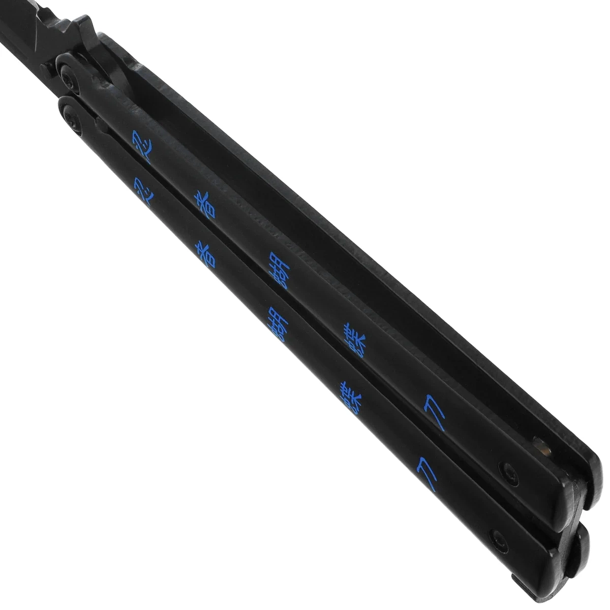 Rękojeść - wykonana z czernionej stali nierdzewnej, oferując odpowiednią wagę i sztywność, sprzyjającą wykonywaniu efektownych trików. Symetryczna konstrukcja ramion ułatwia zachowanie balansu, co jest istotne podczas treningu manipulacji. Dekoracyjne frezowania oraz niebieskie detale nawiązują do stylistyki inspirowanej kulturą orientalną. Zaokrąglone krawędzie poprawiają komfort uchwytu, choć brak teksturowania ogranicza przyczepność w wilgotnych warunkach. Klasyczny zatrzask (latch) zamyka ramiona, zabezpieczając nóż podczas przenoszenia. To estetyczny balisong, który wyróżnia się zarówno na wystawie, jak i w dłoni.