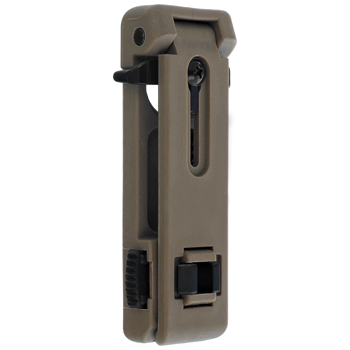 UBC-02 KH Swiveling Belt / MOLLE Clip, opcjonalne mocowanie transportowe zapinane na pas, alternatywnie do zamocowania pod taśmy w standardzie MOLLE MIL STD. Przeznaczone do przenoszenia nylonowych lub plastykowych ładownic, uchwytów, kabur czeskiej firmy ESP na magazynki, pałki teleskopowe, paralizatory, latarki, gaz pieprzowy.