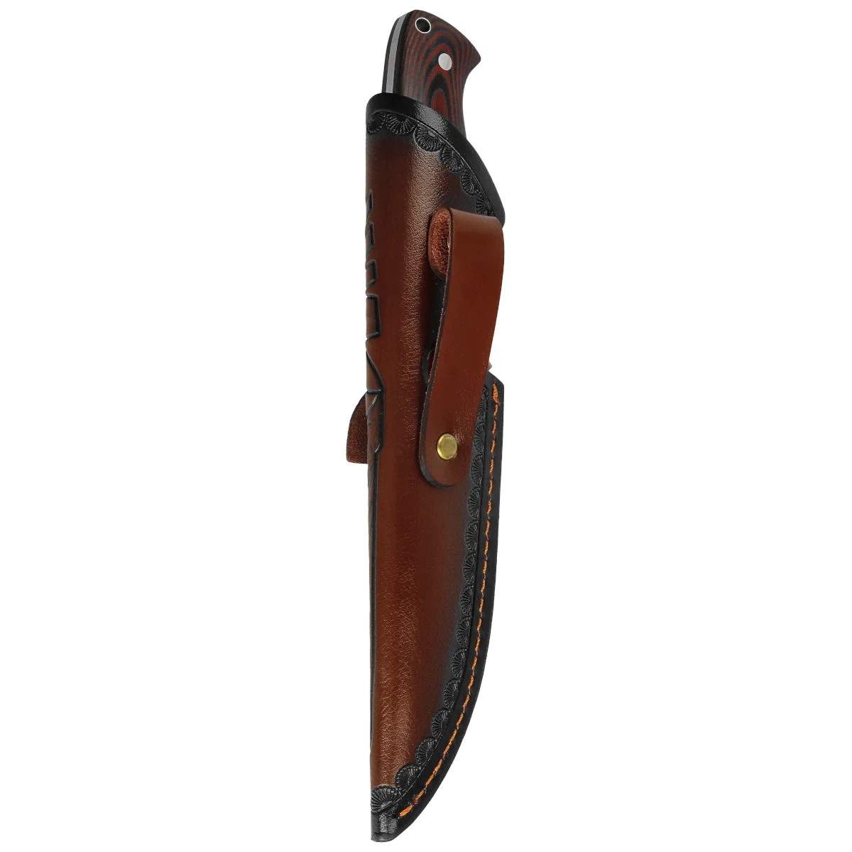 Rękojeść - wykonana z Micarty w odcieniu brązu zapewnia odporność na wilgoć, zabrudzenia oraz uszkodzenia mechaniczne, zachowując swoje właściwości nawet w zmiennych warunkach pogodowych. Jej ergonomiczny kształt z subtelnymi podcięciami pod palce umożliwia naturalne i pewne prowadzenie ostrza, także podczas pracy w rękawicach. Konstrukcję wsparto trzema stalowymi nitami, co zwiększa sztywność i bezpieczeństwo użytkowania. Powierzchnia rękojeści zachowuje dobrą przyczepność, nawet w kontakcie z wodą lub potem. W zestawie znajduje się pochwa ze skóry naturalnej w klasycznym stylu, przystosowana do pionowego mocowania przy pasie. Całość tworzy narzędzie o wysokiej kulturze pracy – trwałe, praktyczne i estetyczne w codziennym użytkowaniu terenowym.