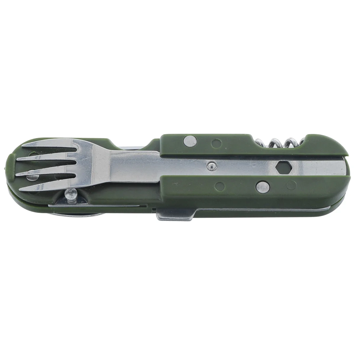 Camping 6 Set Green ABS, Satin – kompaktowy niezbędnik turystyczny z sześcioma funkcjami, wykonany z satynowanej stali nierdzewnej 3Cr13MoV i tworzywa ABS, z etui z nylonu. Praktyczny zestaw do wypraw terenowych.