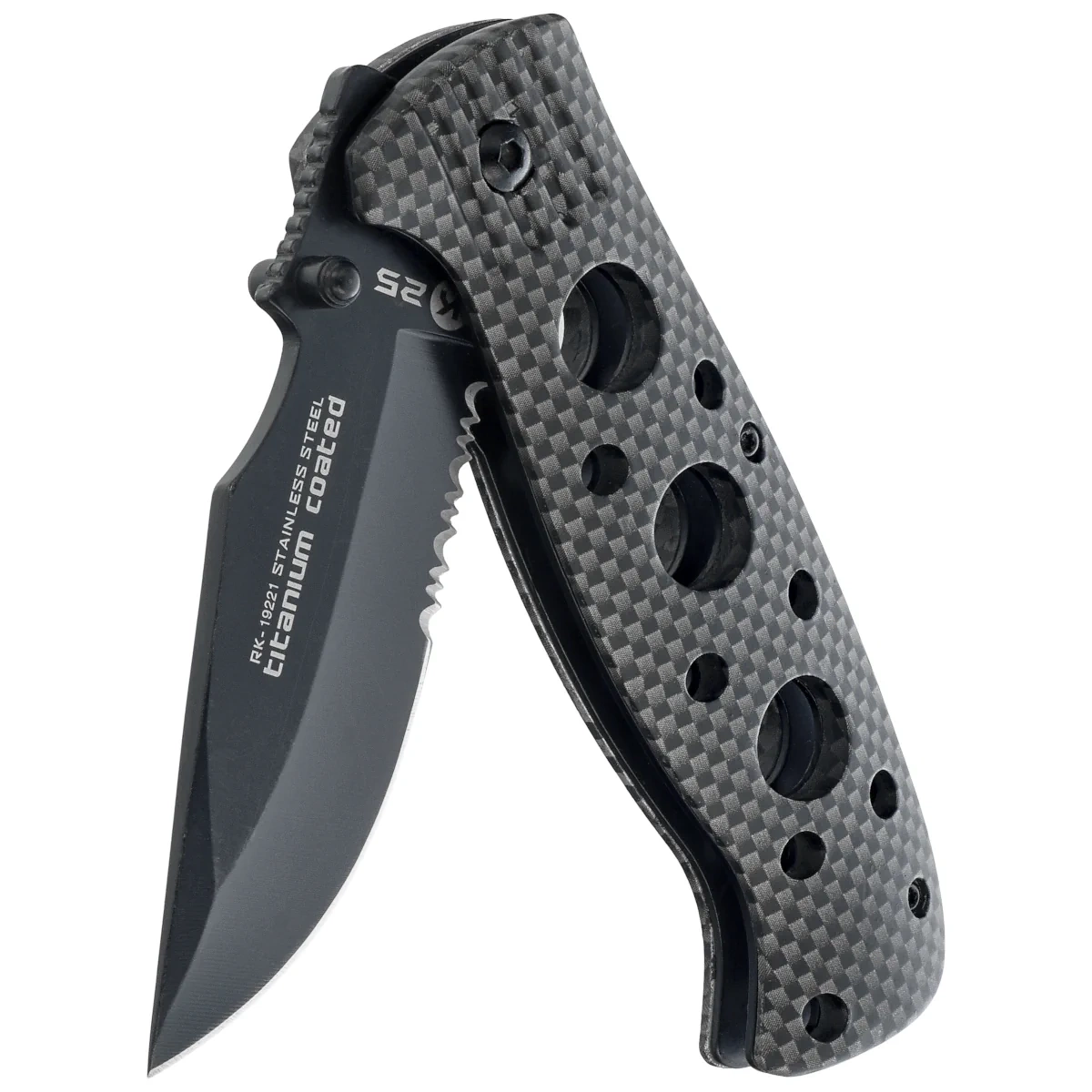 - RK-19221 Rubbered Black Aluminium, Black Titanium – składany nóż taktyczny EDC marki K25 z ostrzem drop point pokrytym black titanium i rękojeścią z gumowanego aluminium. Kompaktowa konstrukcja z blokadą liner lock, klipsem i pochwą nylonową.