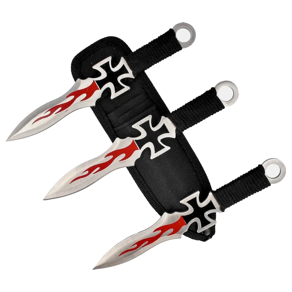 - Black Cross Set 3szt 3Cr13MoV – zestaw noży do rzucania typu dart o konstrukcji full tang, wykonanych ze stali nierdzewnej i owiniętych czarnym paracordem. W komplecie nylonowa pochwa transportowa z przegrodami.