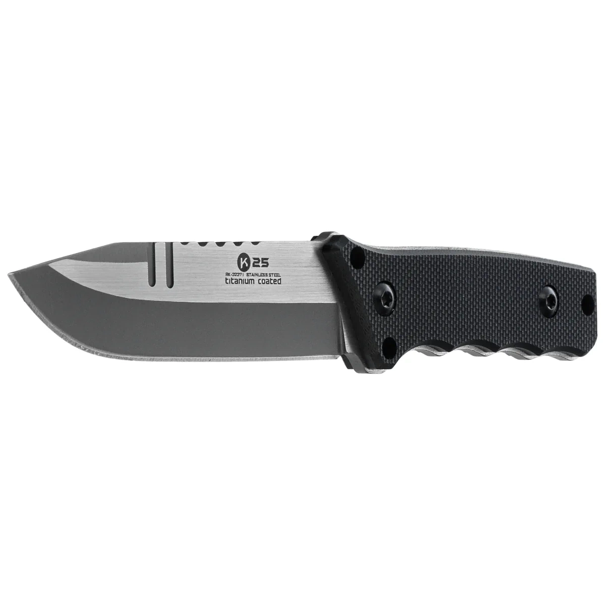 - RK-32371 Tactical Neck Knife Black G10, Titanium – taktyczny nóż na szyję z konstrukcją full tang, ostrzem ze stali 7Cr17Mov pokrytym powłoką tytanową, rękojeścia z kompozytu G10 oraz pochwą Kydex z łańcuszkiem. Lekki i dyskretny.
