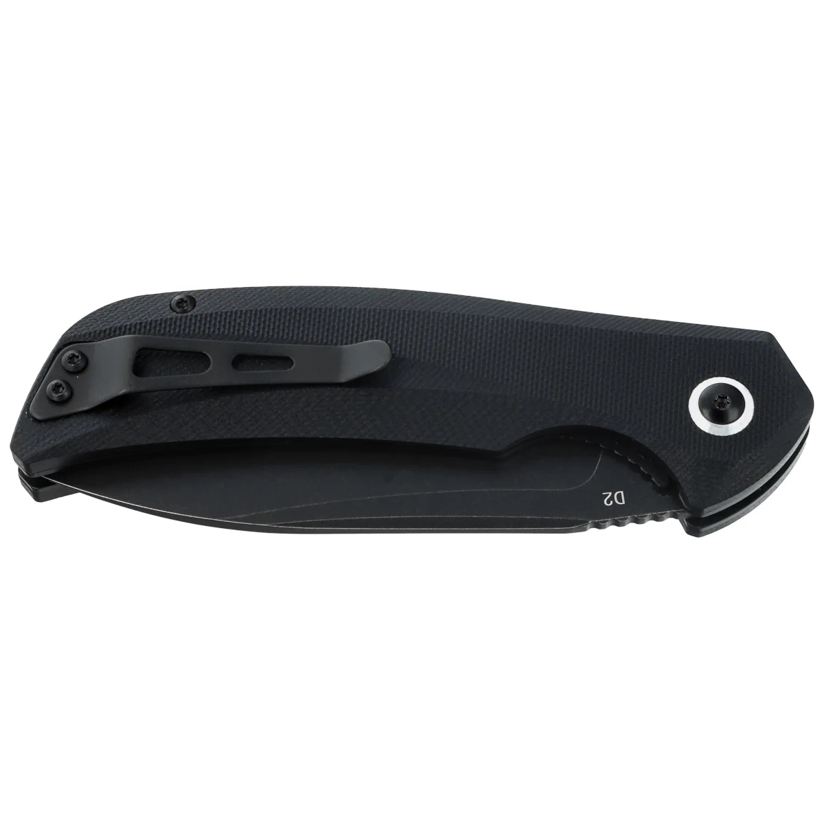 Rękojeść - wykonana z odpornego na czynniki zewnętrzne kompozytu G10, który łączy niską masę z wysoką odpornością na ścieranie, wilgoć oraz uszkodzenia mechaniczne. Delikatna tekstura powierzchni wraz z profilowanym kształtem uchwytu zapewnia stabilny i pewny chwyt w każdych warunkach użytkowania — zarówno w dłoniach suchych, jak i wilgotnych czy w rękawicach. Subtelne wcięcia na palce zwiększają komfort pracy oraz minimalizują zmęczenie dłoni przy dłuższym użytkowaniu. Konstrukcję uzupełnia stalowy klips do przenoszenia w pozycji tip-up, umożliwiający dyskretne mocowanie w kieszeni. Prosta, funkcjonalna forma łączy codzienną wygodę użytkową z technicznym, dyskretnym wyglądem.