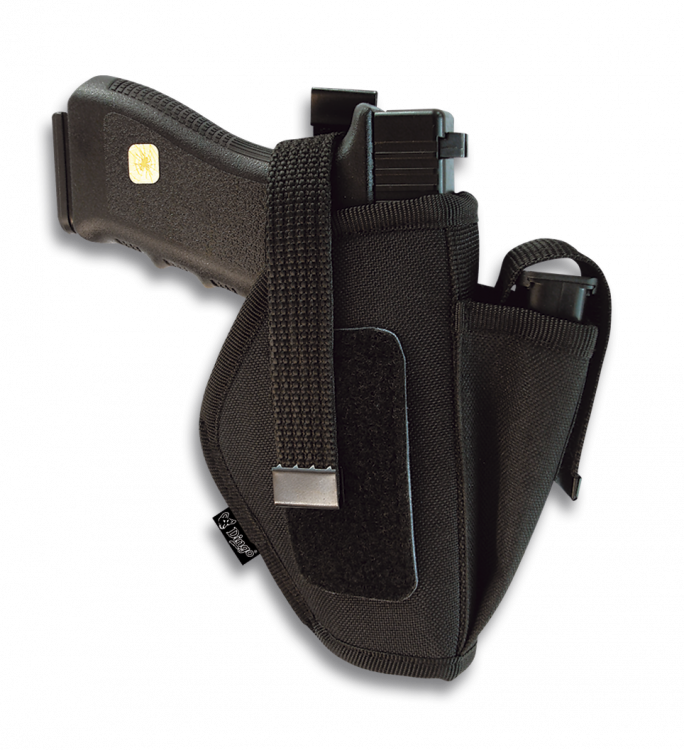 Korpus kabury wykonano z nylonu, odpornego na przetarcia, wilgoć i intensywne użytkowanie. Miękkie podszycie wewnętrzne chroni powierzchnię pistoletu przed zarysowaniami, zapewniając jednocześnie większy komfort noszenia. Dodatkowa zewnętrzna kieszeń na magazynek umożliwia szybki dostęp do amunicji, co jest istotne zarówno w warunkach operacyjnych, jak i podczas ćwiczeń strzeleckich. Regulowany pasek z napem stabilizuje broń w kaburze, zapobiegając jej przypadkowemu wysunięciu.