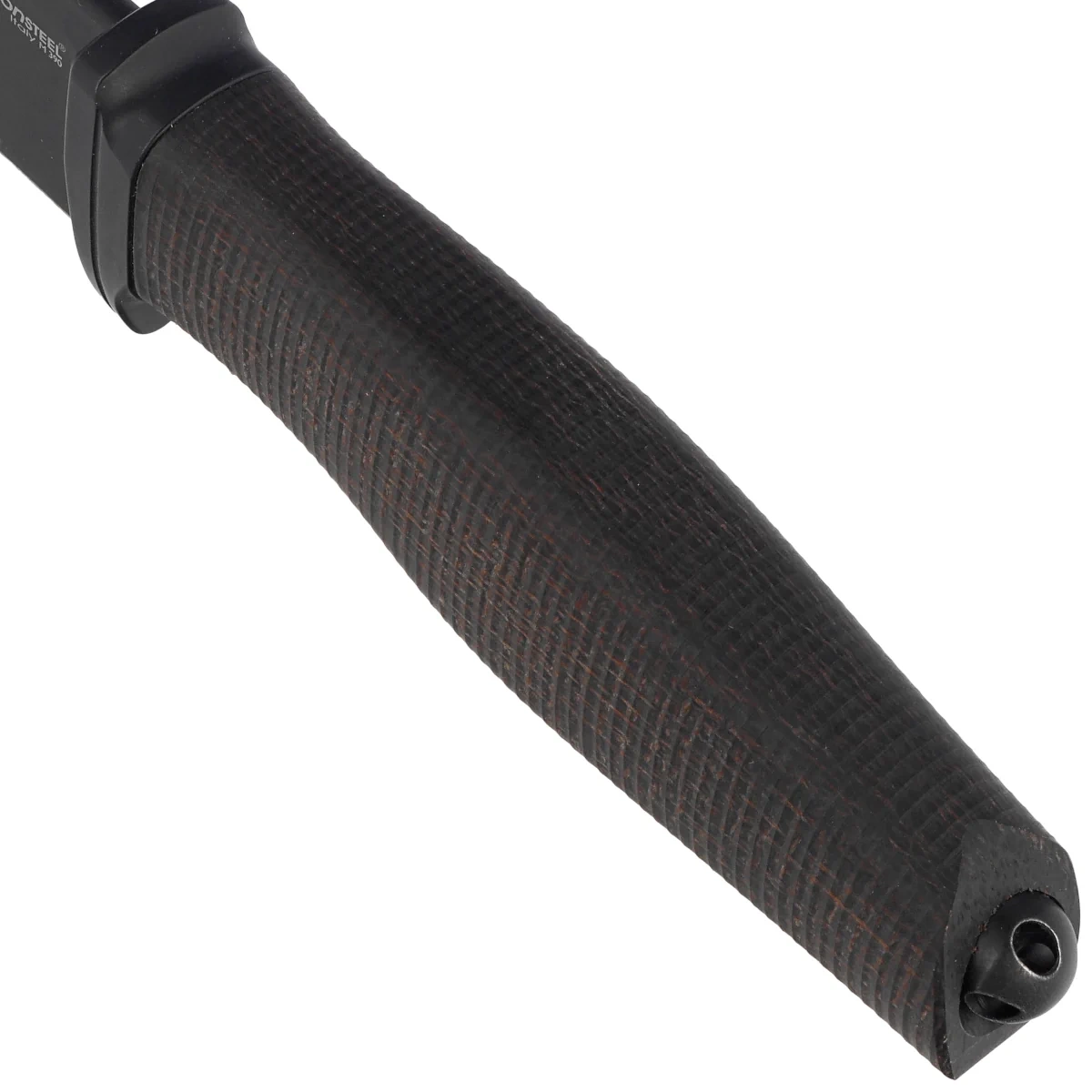 Głownia - zaprojektowana z myślą o trwałości, precyzji i wysokiej odporności eksploatacyjnej. Wykonana z proszkowej stali Böhler M390, głownia oferuje znakomite parametry tnące, długotrwałe utrzymanie ostrości oraz odporność na korozję – nawet w środowiskach narażonych na wilgoć i zabrudzenia. Profil drop point zapewnia uniwersalność działania, a długa, płynna krawędź tnąca sprawdza się w szerokim zakresie prac użytkowych. Dzięki płaskiemu szlifowi (flat grind) ostrze zyskuje niski opór podczas cięcia i optymalną grubość roboczą, co sprzyja zarówno precyzyjnym operacjom, jak i bardziej obciążającym zadaniom. Powierzchnia klingi została wykończona metodą Stonewashed a następnie pokryta czarną powłoką, która zmniejsza odbicia światła i maskuje mikrorysy, jednocześnie podkreślając estetykę noża. Integralny jelec z tytanu nie tylko zwiększa bezpieczeństwo pracy, ale również wzmacnia strukturę całej konstrukcji.