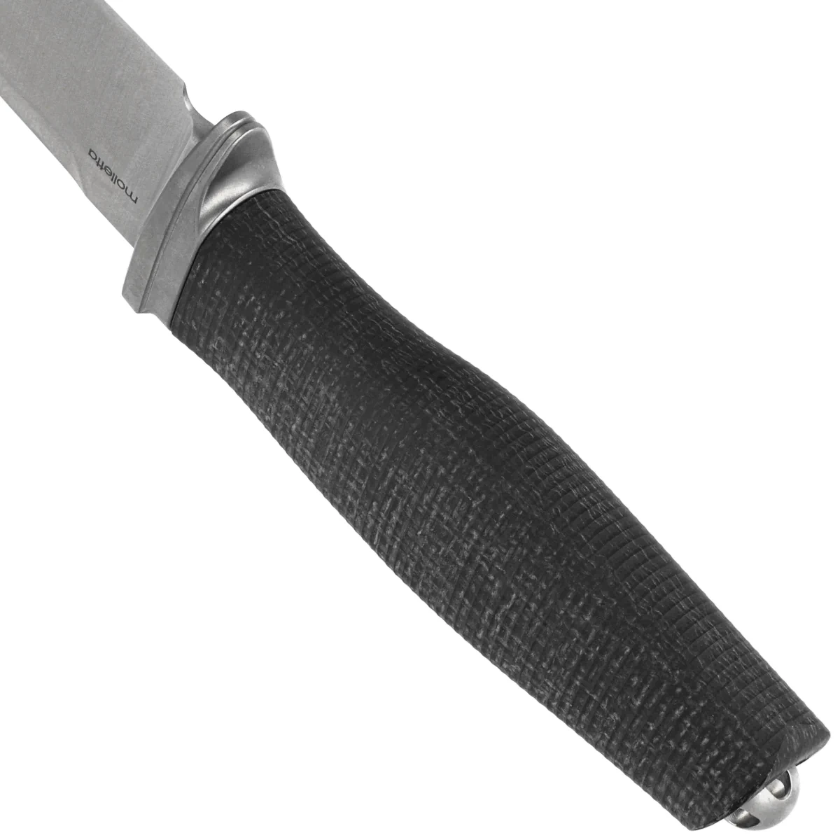 - Acha Black Burlap Micarta, Satin – wytrzymały nóż z głownią stałą LionSteel zaprojektowany przez Michele "Mollettę" Pensato, z ostrzem ze stali premium Böhler M390 i rękojeścią z kompozytu Burlap Micarta, wzmocnioną tytanowym jelcem. Skórzana pochwa.