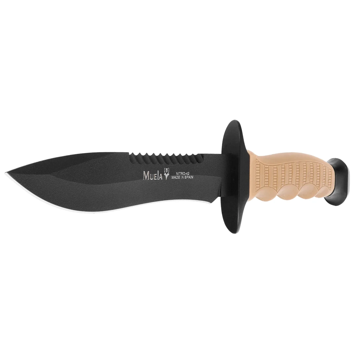 - Muela 85-161.D pełnowymiarowy nóż ze stałym ostrzem o profilu Bowie. Wykonany ze stali nierdzewnej Nitro-42 pokrytej ochronnym czarnym wykończeniem z wytrzymałą rękojeścią wykonaną z gumy i zamaku. Zaprojektowany do zastosowań terenowych i taktycznych.