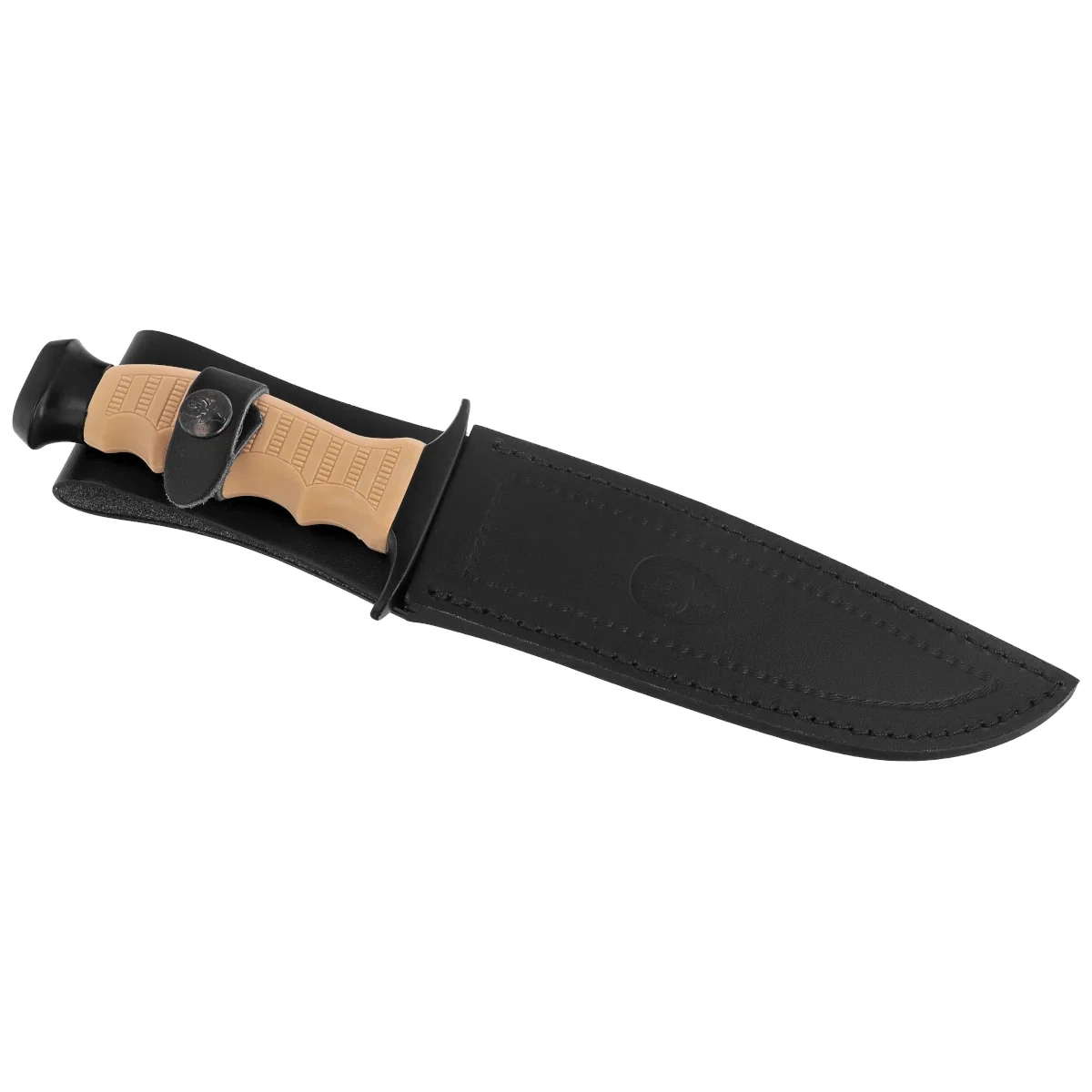 Muela 85-161.D Desert Rubber, Black to duży nóż w stylu Bowie, stworzony z myślą o użytkownikach oczekujących funkcjonalności i pewności działania w warunkach terenowych i taktycznych. Hiszpańska marka Muela, znana z trwałości i solidności oferuje w tym modelu pełnowymiarową głownię, przystosowaną do intensywnej eksploatacji – zarówno w survivalu, jak i zastosowaniach profesjonalnych. Głownia wykonana została ze stali Nitro‑42, poddanej azotowaniu dla zwiększenia odporności na korozję oraz poprawy parametrów mechanicznych. Pokrycie czarną powłoką wzmacnia powierzchnię i zmniejsza widoczność uszkodzeń, a wyrazista geometria typu bowie pozwala na skuteczne cięcia z dużą kontrolą nad ostrzem. Dodatkowym atutem jest grzbietowa piła, umożliwiająca przecinanie materiałów włóknistych, co rozszerza funkcjonalność noża w terenie. Rękojeść oparto na konstrukcji z zamaku i teksturyzowanej gumy, co zapewnia wysoką odporność na uszkodzenia, doskonałą przyczepność oraz trwałość w każdych warunkach pogodowych. Ergonomiczny profil chwytu ułatwia operowanie nożem w rękawicach i w trudnym terenie, a zintegrowana głowica i jelec poprawiają bezpieczeństwo. Muela 85-161.D to propozycja dla osób potrzebujących solidnego narzędzia terenowego – niezawodnego, wszechstronnego i gotowego na każde zadanie.