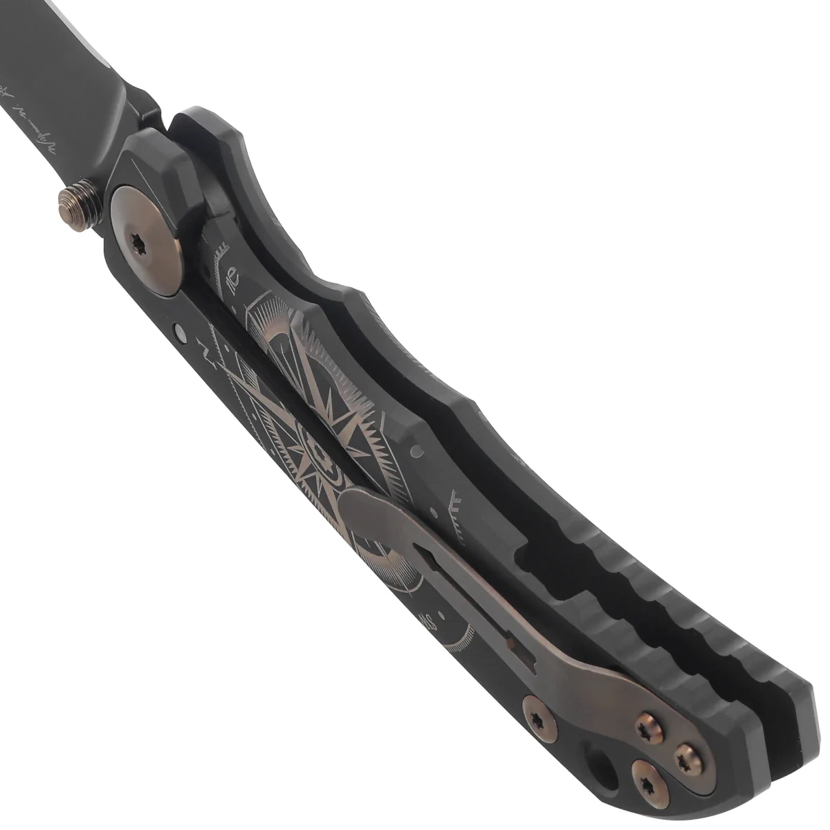 Solidna rękojeść z tytanu ozdobiona jest artystycznym grawerunkiem, przedstawiającym motyw kompasu z Różą Wiatrów. Całość uzupełniają anodowane na brąz detale, które efektownie kontrastują z czarnym kolorem rękojeści. Dzięki odpowiednio wyprofilowanemu uchwytowi nóż pewnie leży w dłoni, zapewniając precyzję podczas wykonywania różnorodnych działań. Solidny mechanizm blokujący typu frame lock gwarantuje bezpieczne użytkowanie nawet w ekstremalnych warunkach. Każdy egzemplarz jest wykonywany ręcznie w USA, co czyni go wartościowym i poszukiwanym przedmiotem zarówno wśród kolekcjonerów, jak i wymagających użytkowników.
