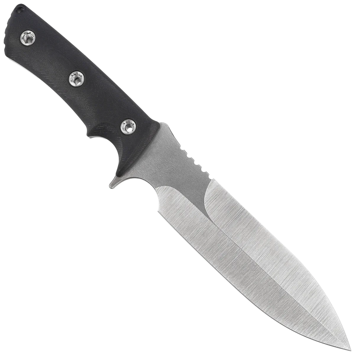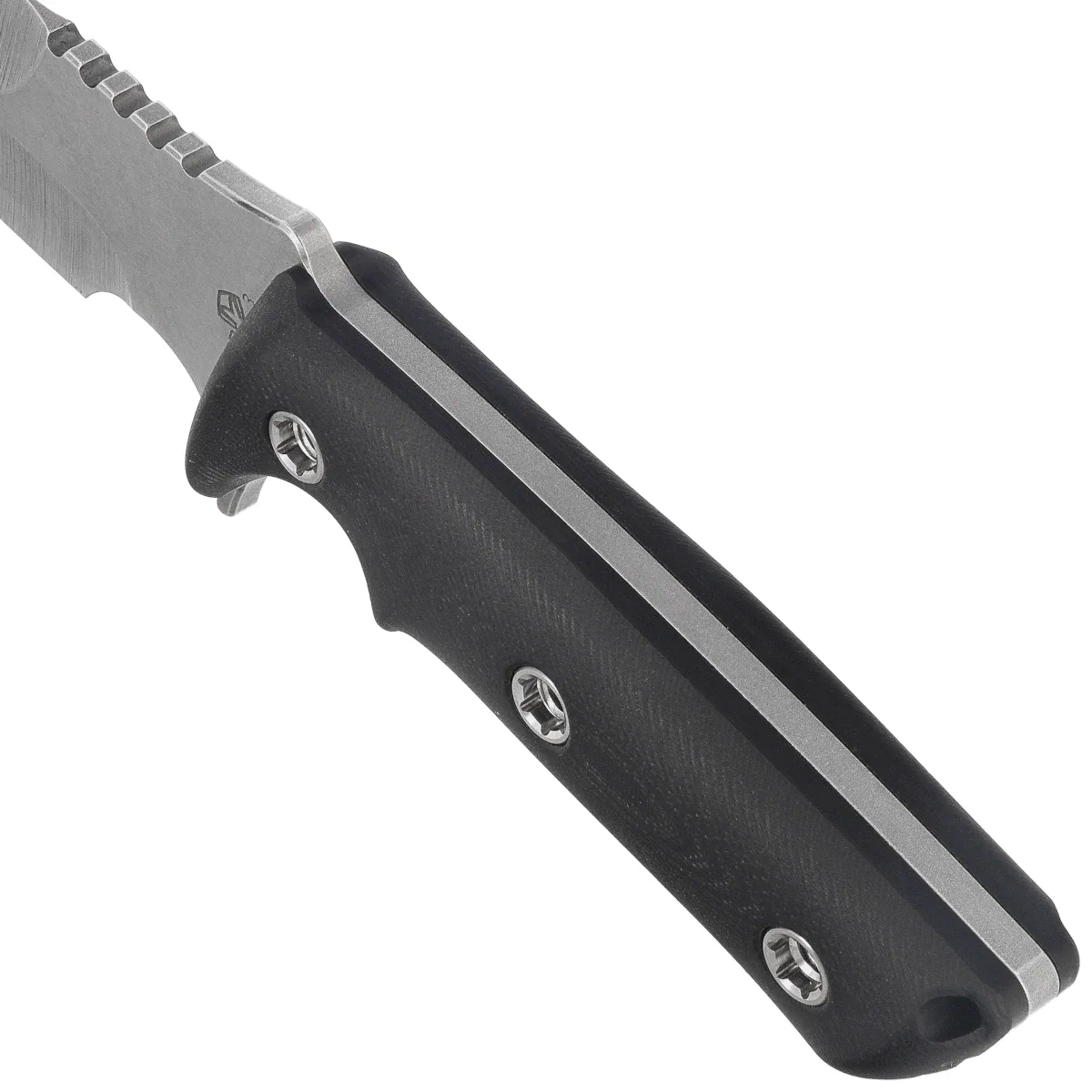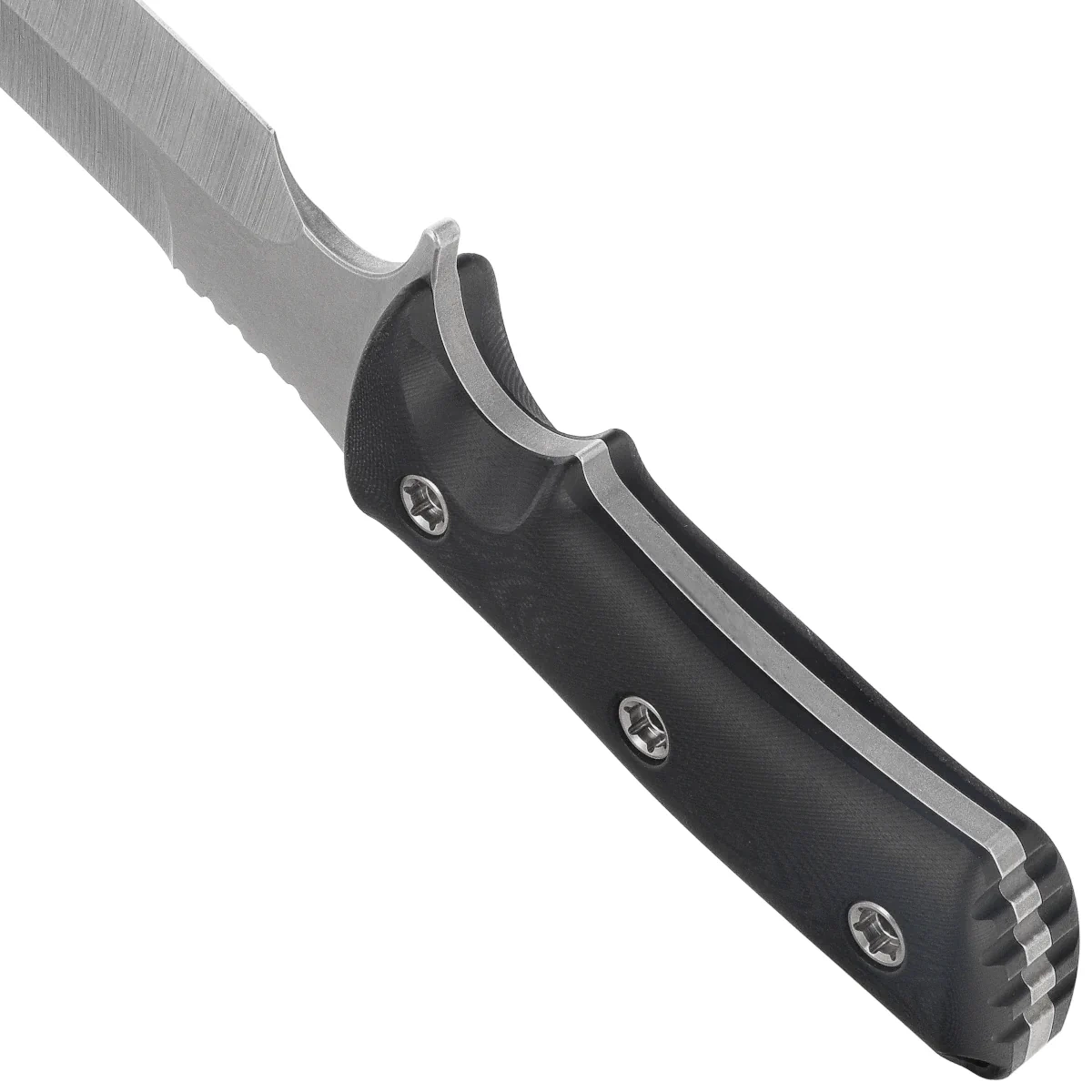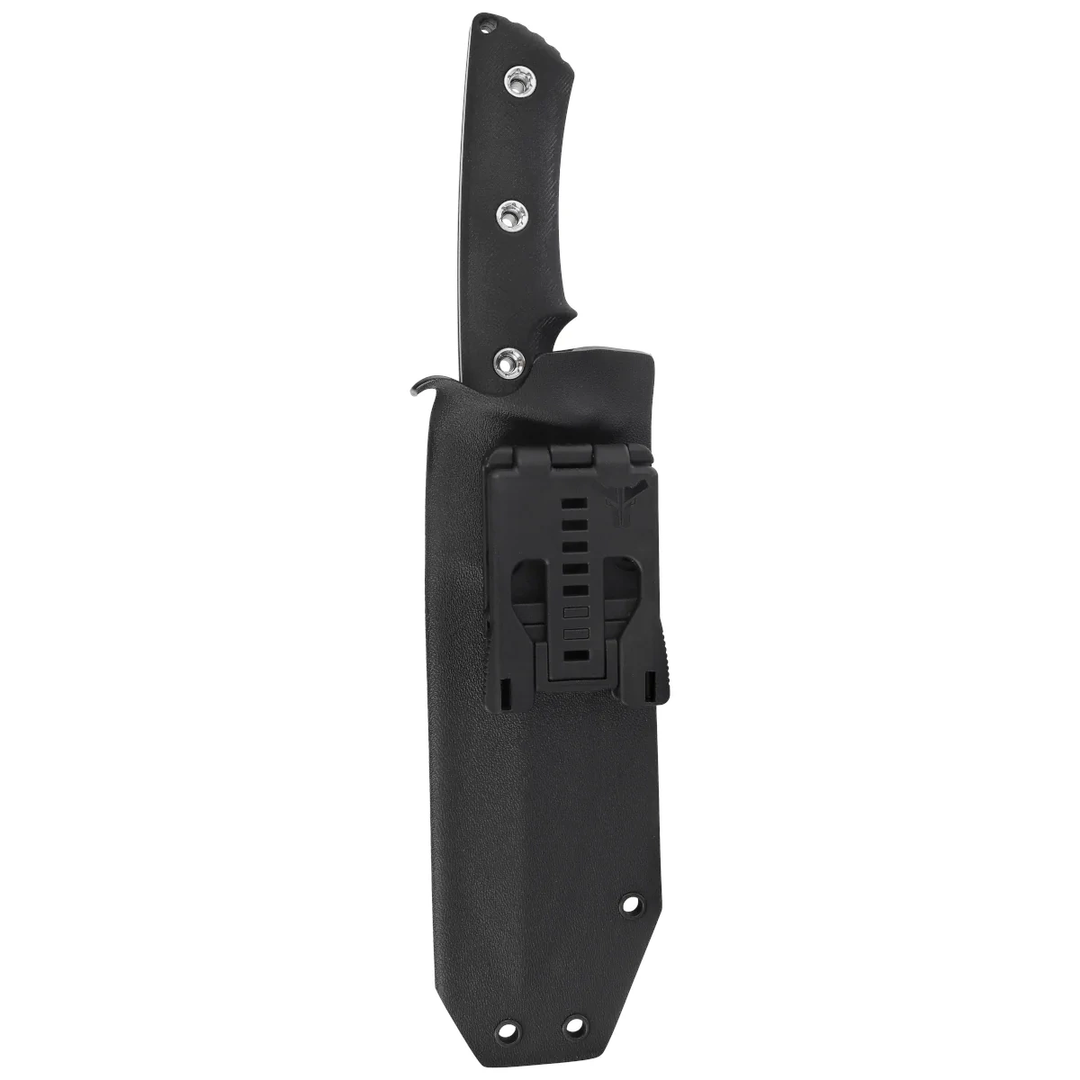 Rękojeść - z czarnego G10 zapewnia doskonałą odporność na warunki atmosferyczne i uszkodzenia mechaniczne. Jej frezowana powierzchnia oraz ergonomiczny kształt umożliwiają pewny chwyt w każdych warunkach – niezależnie od tego, czy użytkownik ma mokre dłonie czy nosi rękawice. Trzy śruby solidnie mocują okładziny do trzpienia, eliminując jakiekolwiek luzy. W tylnej części rękojeści znajduje się otwór na linkę, pozwalający na zabezpieczenie noża w trakcie operacji terenowych. Całość uzupełnia pochwa z tworzywa z montażem Tek-Lok, gwarantująca szybki dostęp i stabilne mocowanie.