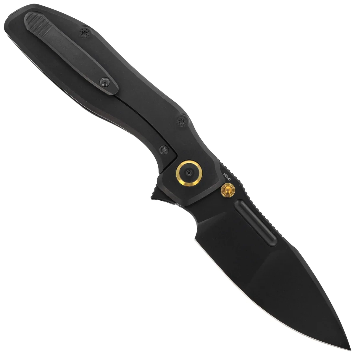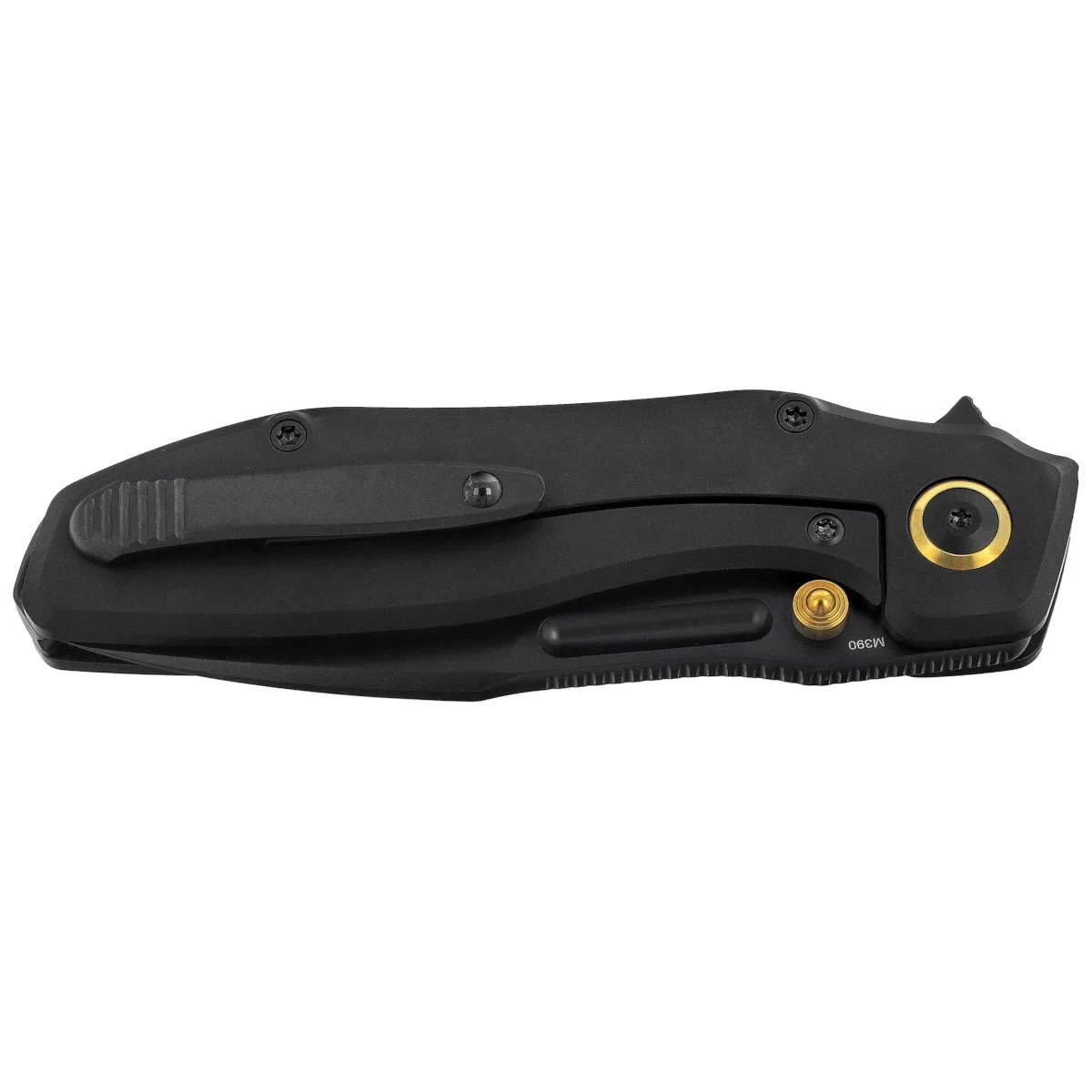 Głownia - modyfikowany profil drop point z zaokrąglonym brzuścem i wyraźnym czubkiem zapewnia doskonałą precyzję cięcia oraz trwałość podczas intensywnego użytkowania. Ostrze wykonano z stali M390, znanej z ekstremalnej odporności na zużycie i zachowania ostrości przez długi czas. Szlif compound łączy cienką krawędź roboczą z wklęslym szlifem przy rękojesci, z mocniejszym przekrojem plaskiego szlifu przy czubku. Czarna powłoka DLC podkreśla techniczny styl całości. Głownia porusza się na łożyskach ceramicznych, gwarantując wyjątkową płynność otwierania. Wydłużone frezowanie na grzbiecie (jimping) oraz ergonomiczne zagłębienie na kciuk poprawiają kontrolę nad ostrzem. Użytkownik ma do dyspozycji trzy sposoby otwierania – flipper, front flipper oraz wycięcie w głowni.
