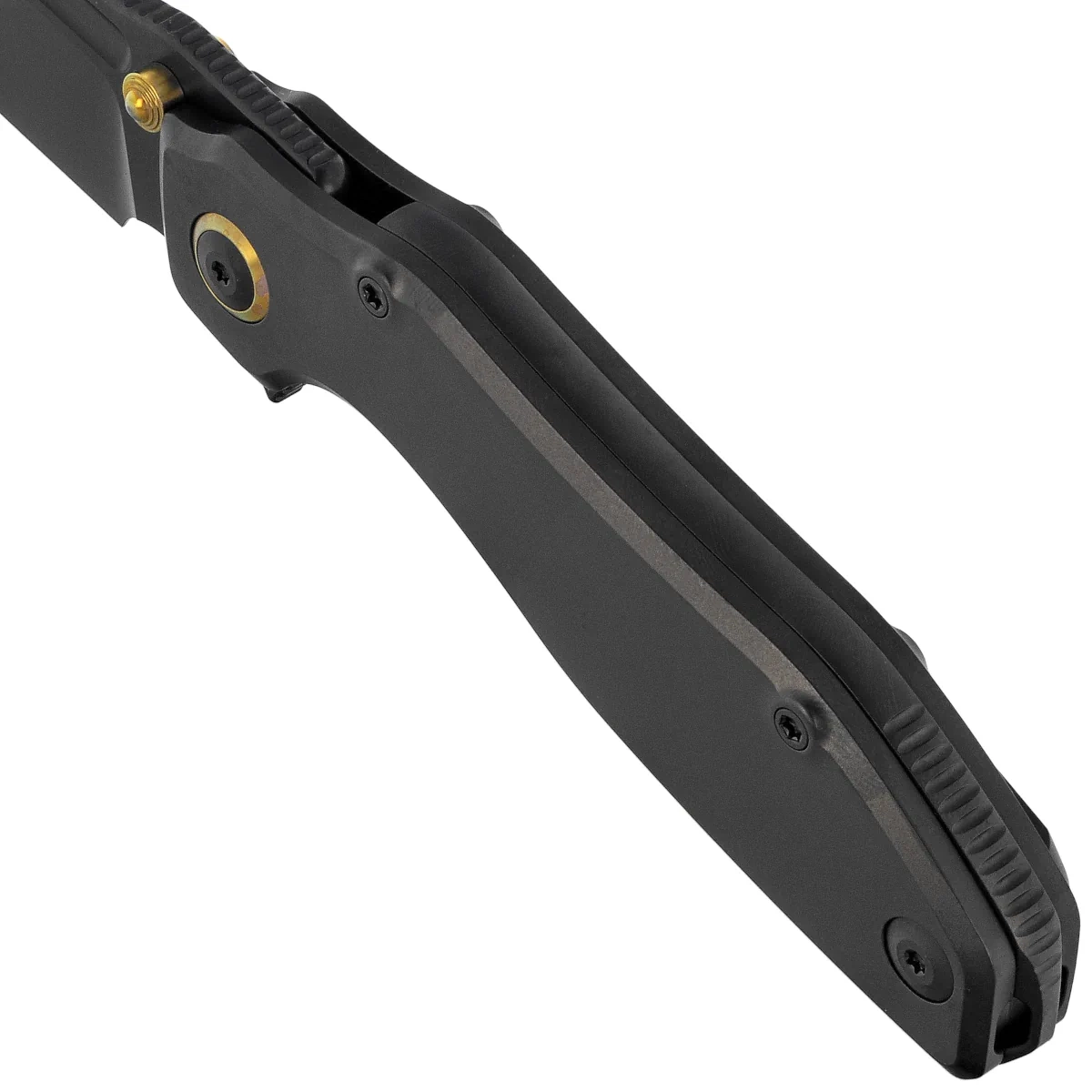 Rękojeść - z tytanu 6AL4V została precyzyjnie obrobiona metodą CNC i również pokryta czarna powłoką DLC. Trójwymiarowe przetłoczenia i profilowanie poprawiają komfort pracy w każdym rodzaju chwytu. Wnętrze wzmacnia pełny backspacer, zapewniający integralność strukturalną. Zastosowana blokada frame lock została wyposażona w stalową wkładkę oraz mechanizm overtravel stop, chroniący przed nadmiernym odchyleniem ramienia. Klips typu deep carry i ukryty otwór na linkę zwiększają funkcjonalność podczas codziennego noszenia. Całość dopełnia innowacyjny system removable/reversible flipper tab, umożliwiający konfigurację otwierania zgodnie z preferencjami użytkownika.