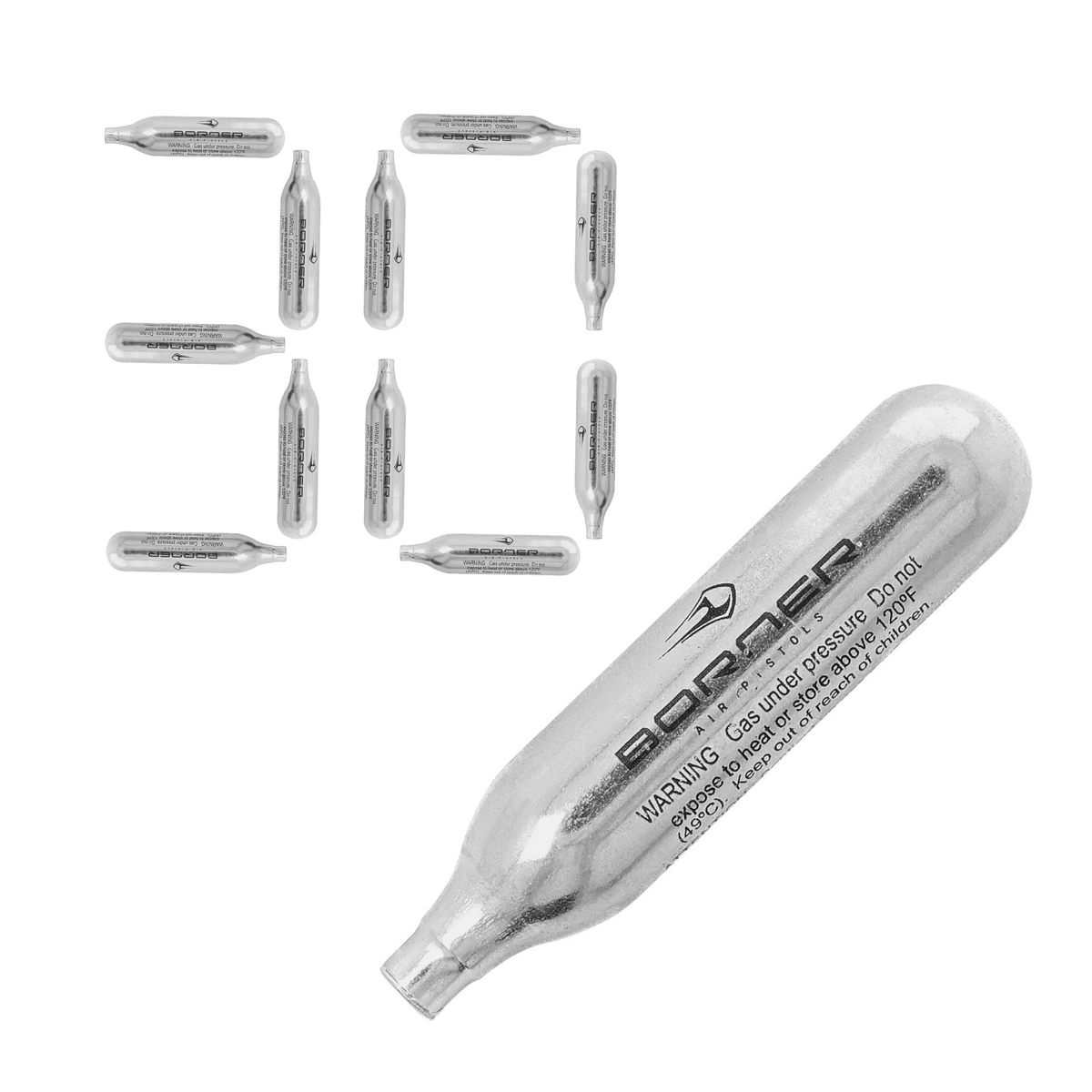 - 12 g kapsuła zasilająca CO2 firmy Borner do pistoletów oraz karabinów pneumatycznych. Naboje CO₂ miotają śrut za pomocą sprężonego dwutlenku węgla. Jedna kapsuła wystarcza na wystrzelenie ok. 60 śrucin.