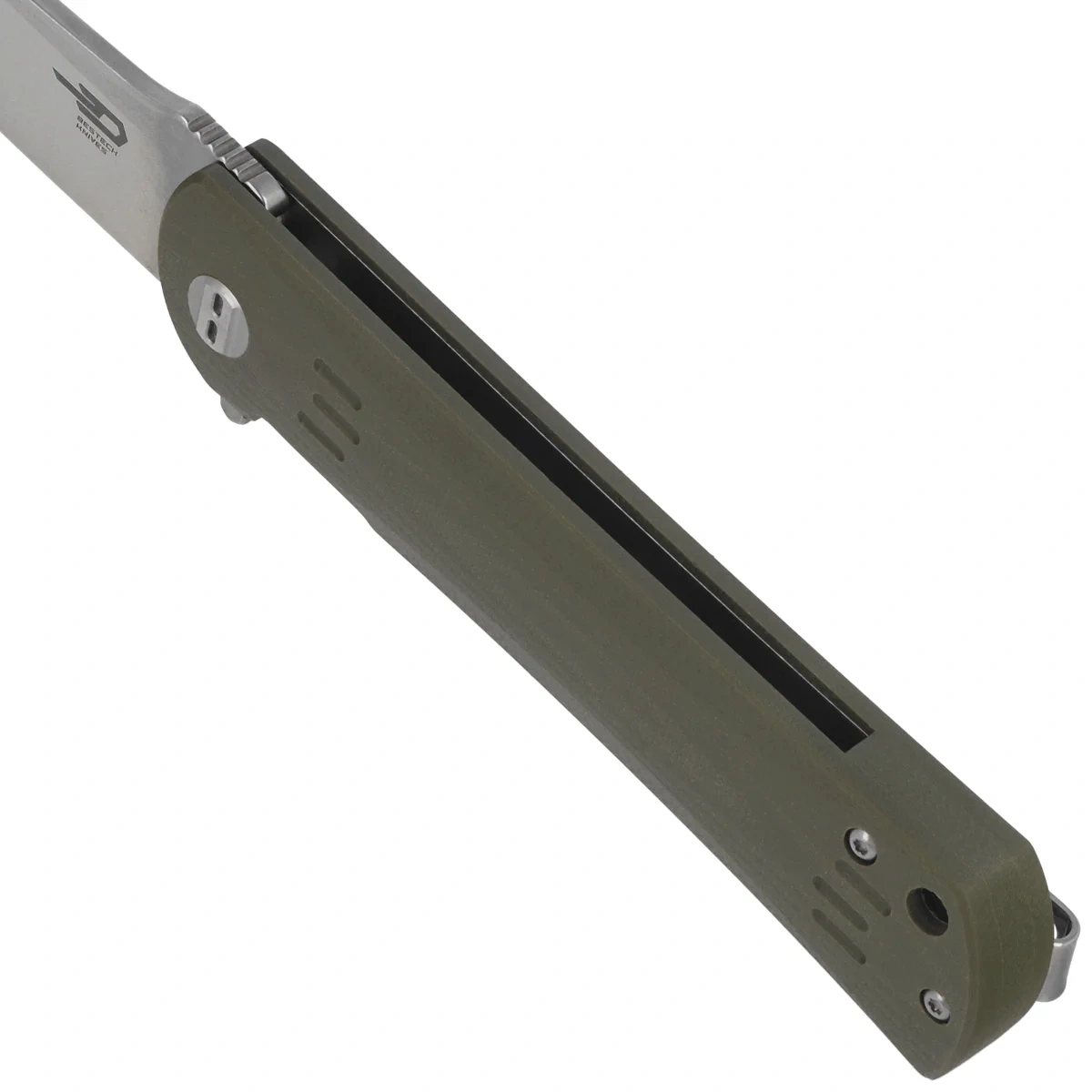 Rękojeść - okładziny z G10, tworzywa niewrażliwego na warunki atmosferyczne, odpornego na chemikalia i uszkodzenia mechaniczne Fazowane krawędzie okładek eliminują ostre ranty a teksturowanie powierzchni poprawia pewność uchwytu. Backspacer do którego przymocowano okładziny gwarantuje sztywność i wytrzymałość całej konstrukcji. Jednopozycyjny, prawostronny klips umożliwia przenoszenie noża w pozycji tip-up, czubkiem ostrza ku górze.