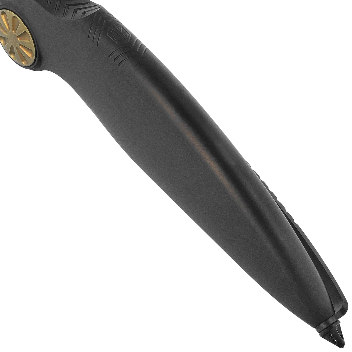 Rękojeść - monolityczna bryła z tytanu 6AL4V, precyzyjnie frezowana, również pokryta powłoką DLC, co nadaje jej elegancki, industrialny charakter. Zintegrowany klips deep carry w stylistyce korespondującej z frezowaniami grzbietowymi umożliwia głębokie i dyskretne przenoszenie. Zastosowany mechanizm frame lock wyposażono w stalową wkładkę, co podnosi jego trwałość. Na końcu rękojeści znajduje się funkcjonalny zbijak do szyb, idealny w sytuacjach awaryjnych. Rękojeść została wyprofilowana z myślą o stabilnym chwycie, zapewniając bezpieczeństwo i komfort użytkowania.
