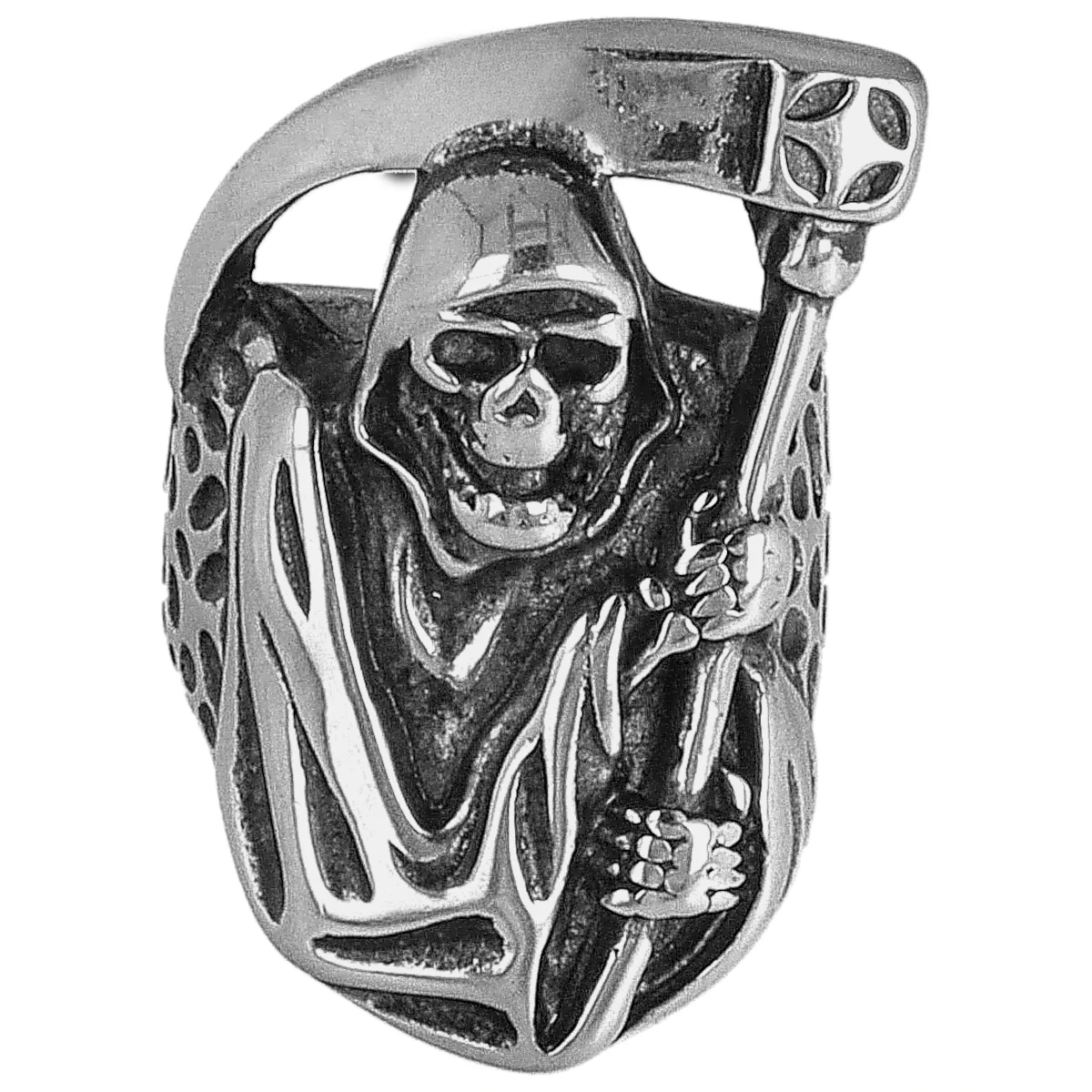 - Pierścień Tole 10 Imperial Scythe Death Ø19 – masywny symbol mrocznej siły, wykonany ze stopu metalu z rzeźbioną postacią Śmierci z kosą. Detale, kontrastowe wykończenie, gotycka estetyka.