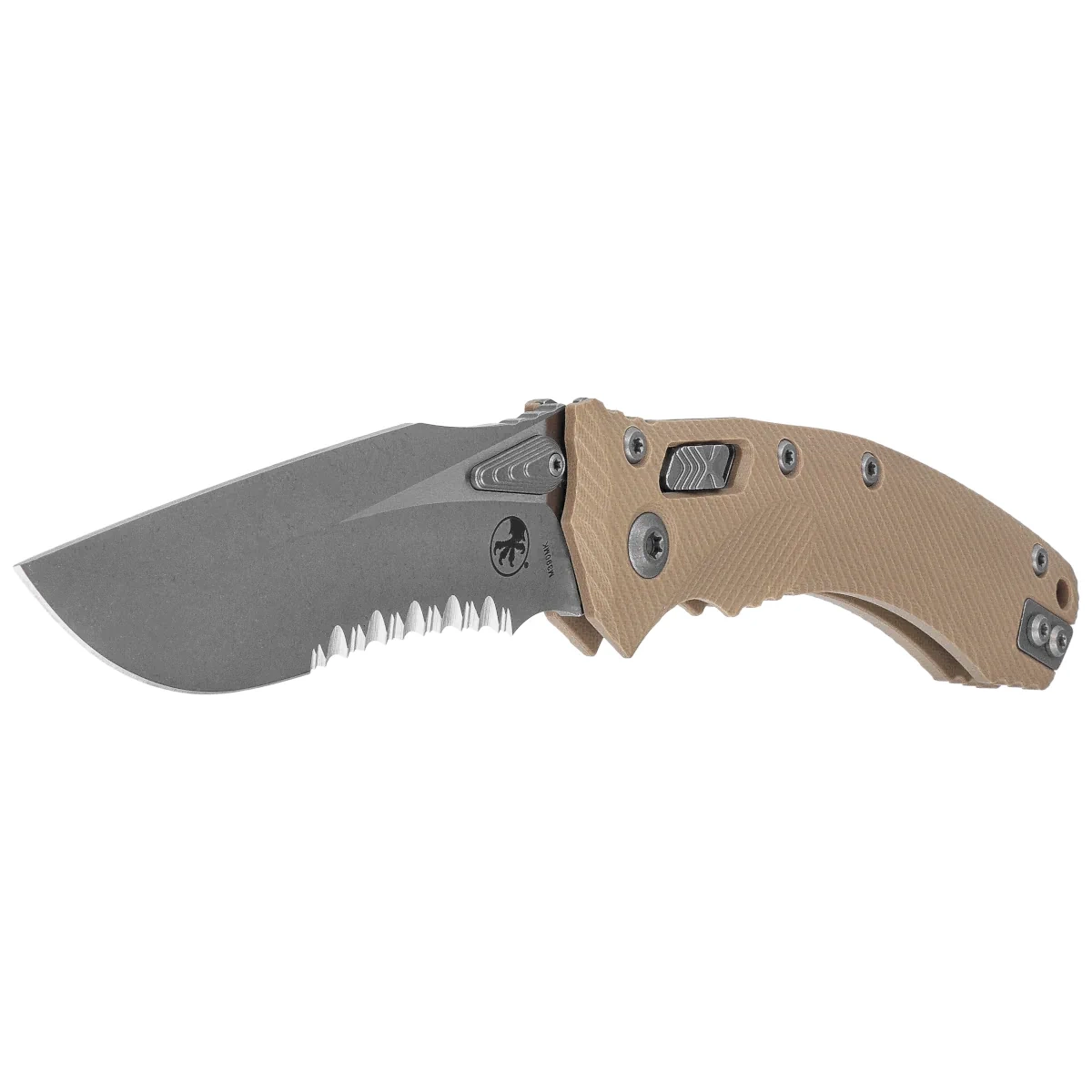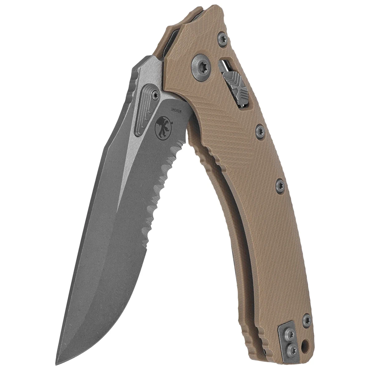 Rękojeść - wykonana z wytrzymałego kompozytu G10, dla lepszego uchwytu pokryta wyfrezowanymi liniami (Fluted). Szeroki suwak blokady z charakterystyczną dla firmy Microtech schodkową strukturą X. Obie okładziny zostały skręcone przy pomocy solidnego, backspacera. Dwustronny (prawa / lewa) tytanowy klips pozwala dyskretnie nosić nóż w pozycji tip-up. Nad klipsem lanyard hole, miejsce na linkę zabezpieczającą lub ozdobną.