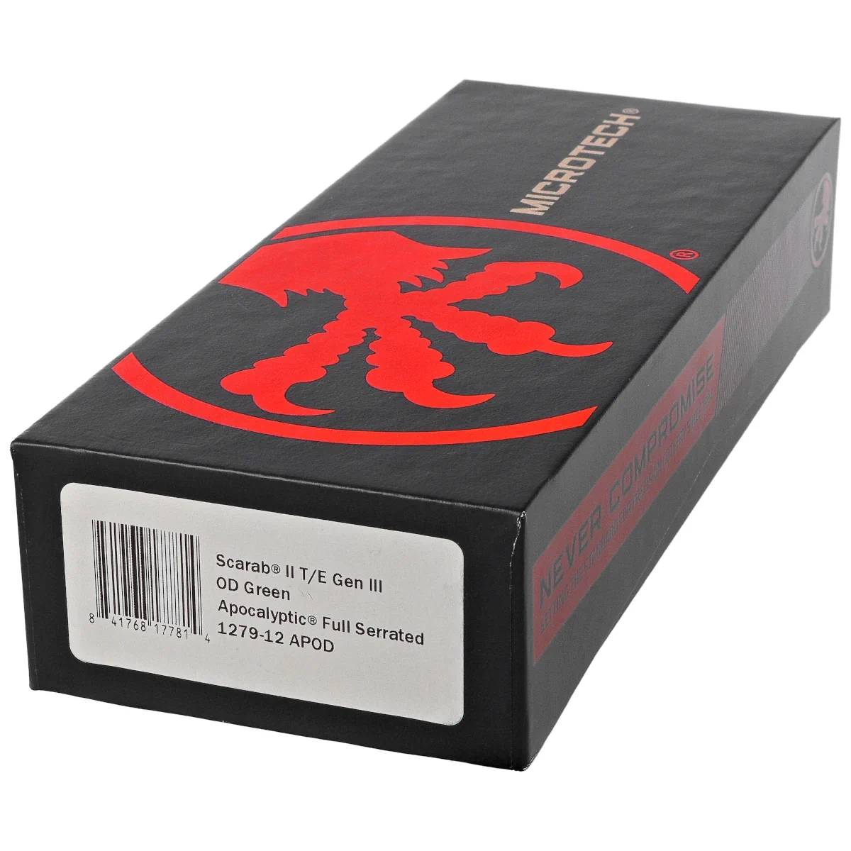 Scarab II Gen III T/E OD Green Aluminium/3M, Apocalyptic F/S to szczyt doskonałości w dziedzinie automatycznych noży taktycznych, czerpiący inspirację z oryginalnego projektu Microtech Ultratech. Zbudowany, aby wytrzymać najtrudniejsze warunki, nowy Scarab II jest najlepszym wyborem do intensywnego użytkowania. Zachowując cechy stylistyczne swojego poprzednika, wyznacza nowy standard dla technologii OTF (Out The Front).