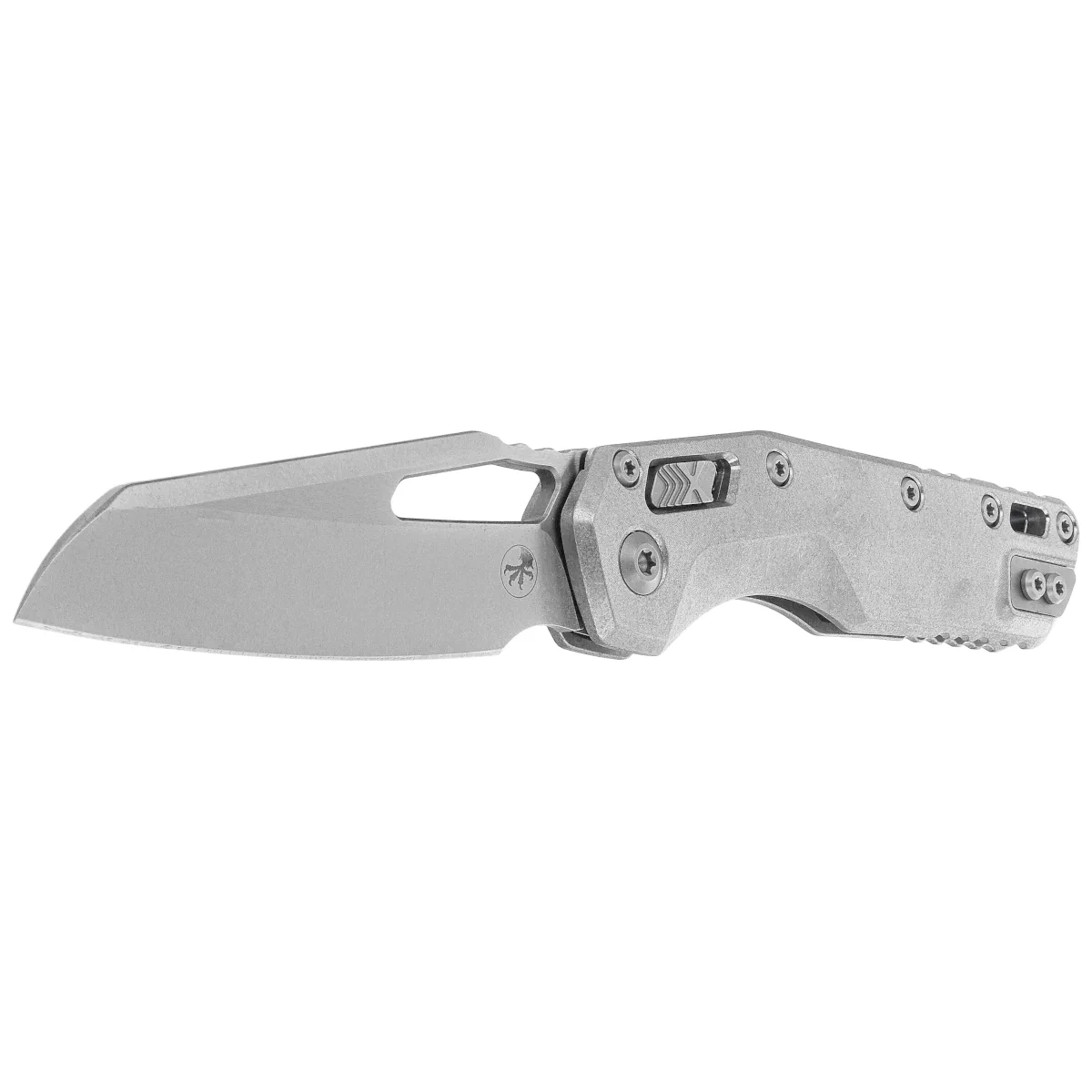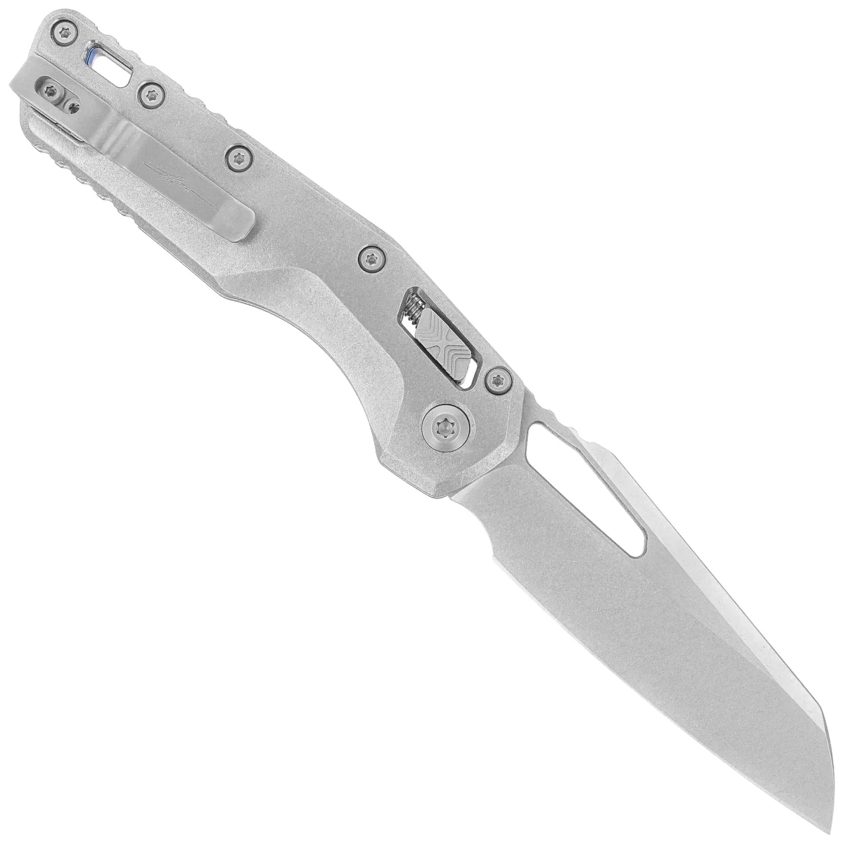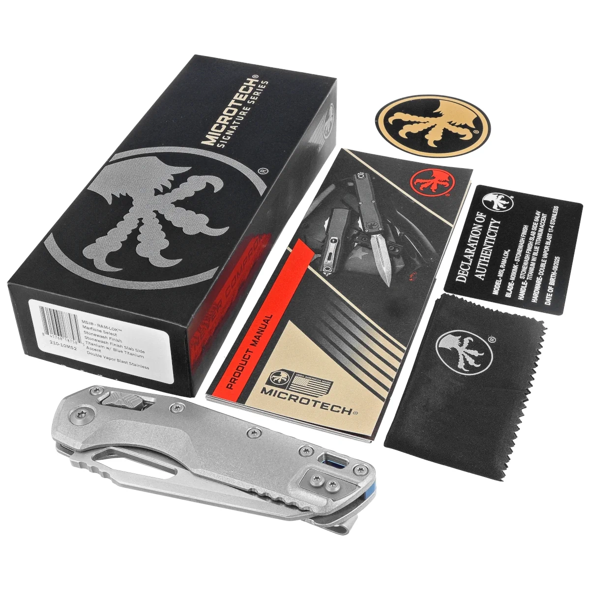 Rękojeść - wykonana z wytrzymałego tytanu, dla lepszego uchwytu wykończona metodą Stonewashed. Szeroki suwak blokady z charakterystyczną dla firmy Microtech schodkową strukturą X. Obie okładziny zostały skręcone przy pomocy solidnego, tytanowego backspacera w kolorze brązu. Dwustronny (prawa / lewa) tytanowy klips pozwala dyskretnie nosić nóż w pozycji tip-up. Nad klipsem lanyard hole, miejsce na linkę zabezpieczającą lub ozdobną.