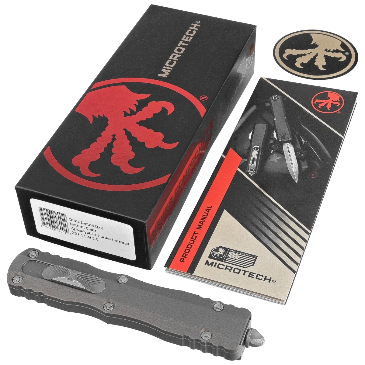 Dirac Delta D/E Natural Clear Aluminium, Apocalyptic P/S to powiększony nóż automatyczny OTF z serii Dirac. Pracujący w trybie D/A, wyposażony w piekielnie szybki mechanizm wysuwający ostrze. Przycisk slidera na boku rękojeści. W 100% wyprodukowany i zmontowany w USA. Projekt Anthony'ego Marfione, knifemakera i właściciela Microtech Knives.