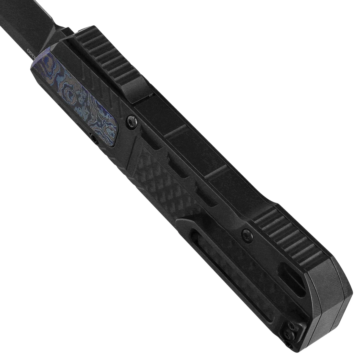 Rękojeść - wykonana na frezarkach CNC z tytanu, z trójwymiarową teksturą. Fazowane krawędzie okładek eliminują ostre ranty oraz poprawiają pewność uchwytu. Wkładka z tytanu barwionego płomieniowo daje wizualny kontrast i poprawia uchwyt. Po prawej stronie kunsztowny suwak do wysuwania/wsuwania klingi. Jednopozycyjny tytanowy (prawa) klips deep carry umożliwia dyskretne przenoszenie noża w kieszeni w pozycji tip-down (czubkiem ostrza do dołu).