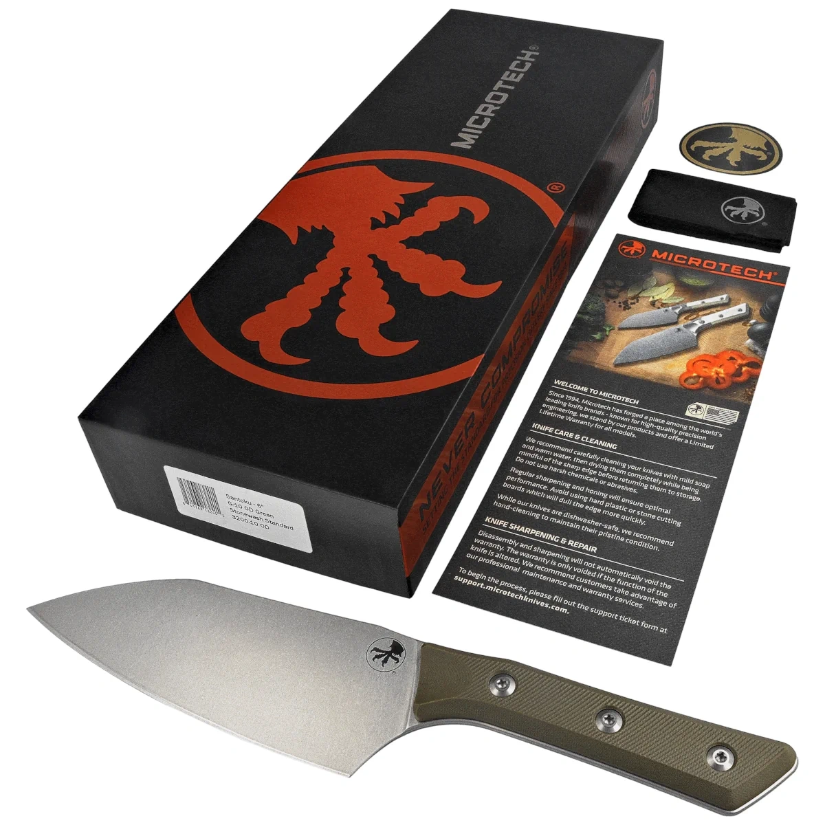 Santoku 6" OD Green G10, Stonewashed to nowoczesna interpretacja tradycyjnego noża kuchennego w wykonaniu jednej z najbardziej cenionych amerykańskich marek nożowniczych. Powstały w duchu technicznej perfekcji i użytkowego minimalizmu, stanowi doskonałe narzędzie dla profesjonalnych kucharzy i pasjonatów precyzyjnego cięcia. Charakterystyczna sylwetka santoku została tu wzbogacona o materiały klasy high-end oraz ergonomię dopracowaną do perfekcji. Głownia wykonana z zaawansowanej stali M390MK oferuje doskonałą retencję ostrości, pełną odporność na korozję oraz stabilność mikrostruktury, nawet przy intensywnym użytkowaniu. Jej wykończenie metodą stonewashed nadaje powierzchni matową fakturę, która skutecznie maskuje ślady użytkowania i dodaje klingi profesjonalnego, roboczego charakteru. Profil santoku sprawia, że nóż z powodzeniem spełnia zadania związane z porcjowaniem, krojeniem i siekaniem, zachowując przy tym płynność pracy i precyzję prowadzenia ostrza. Rękojeść wykonano z wytrzymałego kompozytu G10, materiału odpornego na wilgoć, temperaturę oraz czynniki mechaniczne. Subtelne frezowanie poprawia chwyt, a minimalistyczna geometria uchwytu zapewnia stabilne oparcie dla dłoni – niezależnie od intensywności pracy. Elementy montażowe w postaci śrub typu torx zwiększają sztywność konstrukcji oraz umożliwiają łatwy demontaż w celu konserwacji. Dzięki idealnie zrównoważonemu połączeniu ergonomii, trwałości i nowoczesnego designu, model Santoku od Microtech doskonale sprawdza się zarówno w profesjonalnej kuchni, jak i w rękach użytkownika domowego, który nie uznaje kompromisów w kwestii jakości. Dołączona ochronna osłona na ostrze umożliwia bezpieczne przechowywanie i transport. To nóż, który nie tylko spełnia oczekiwania – on je redefiniuje.