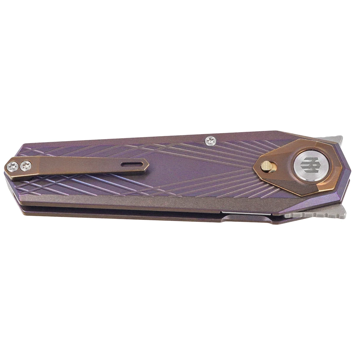 Rękojeść - z tytanu 6AL-4V wyróżnia się minimalistycznym wzornictwem i wyważoną konstrukcją, zapewniając ergonomię, trwałość i niską masę. Frezowane linie zwiększają przyczepność i dodają charakteru technicznego, a precyzyjnie zaoblone krawędzie dbają o komfort chwytu. Dekoracyjna wkładka wokół pivotu podkreśla detal wykonania, łącząc walory estetyczne z symboliką custom designu. Blokada typu button liner lock gwarantuje sztywność i bezpieczeństwo użytkowania, a klips deep carry pozwala na wygodne noszenie noża w kieszeni. Z tyłu backspacera znajduje się również lanyard hole – praktyczny element zwiększający możliwości przenoszenia i personalizacji.