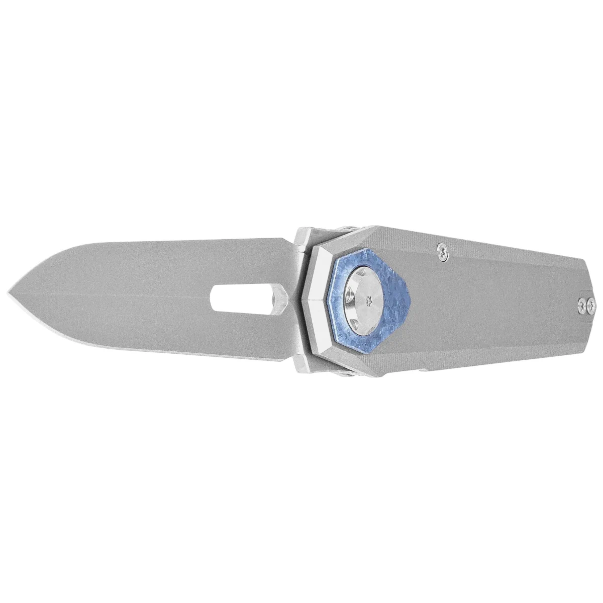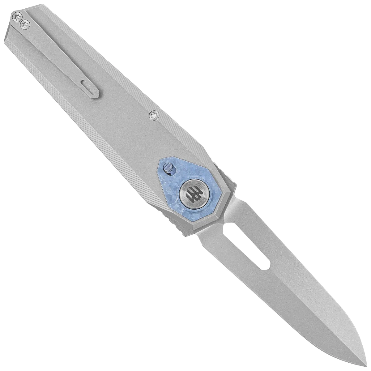 Rękojeść - wykonana z tytanu 6AL-4V i wykończona metodą Ceramic Sandblasted Effect (piaskowanie ceramiką), co zwiększa jej odporność na zużycie, nadaje estetyczny, jednolity wygląd oraz skutecznie maskuje drobne rysy powstające podczas codziennego użytkowania. Całość wyróżnia się minimalistycznym wzornictwem i wyważoną konstrukcją, zapewniającą ergonomię, trwałość i niską masę. Frezowane linie poprawiają przyczepność i nadają rękojeści technicznego charakteru, a precyzyjnie zaoblone krawędzie dbają o wysoki komfort chwytu. Dekoracyjna wkładka wokół pivotu podkreśla dbałość o detale oraz nawiązuje do stylistyki custom designu. Blokada typu button liner lock zapewnia sztywność konstrukcji i pełne bezpieczeństwo użytkowania, natomiast klips deep carry umożliwia wygodne i dyskretne noszenie noża w kieszeni. W tylnej części backspacera umieszczono również lanyard hole – praktyczny element zwiększający możliwości przenoszenia oraz personalizacji noża.