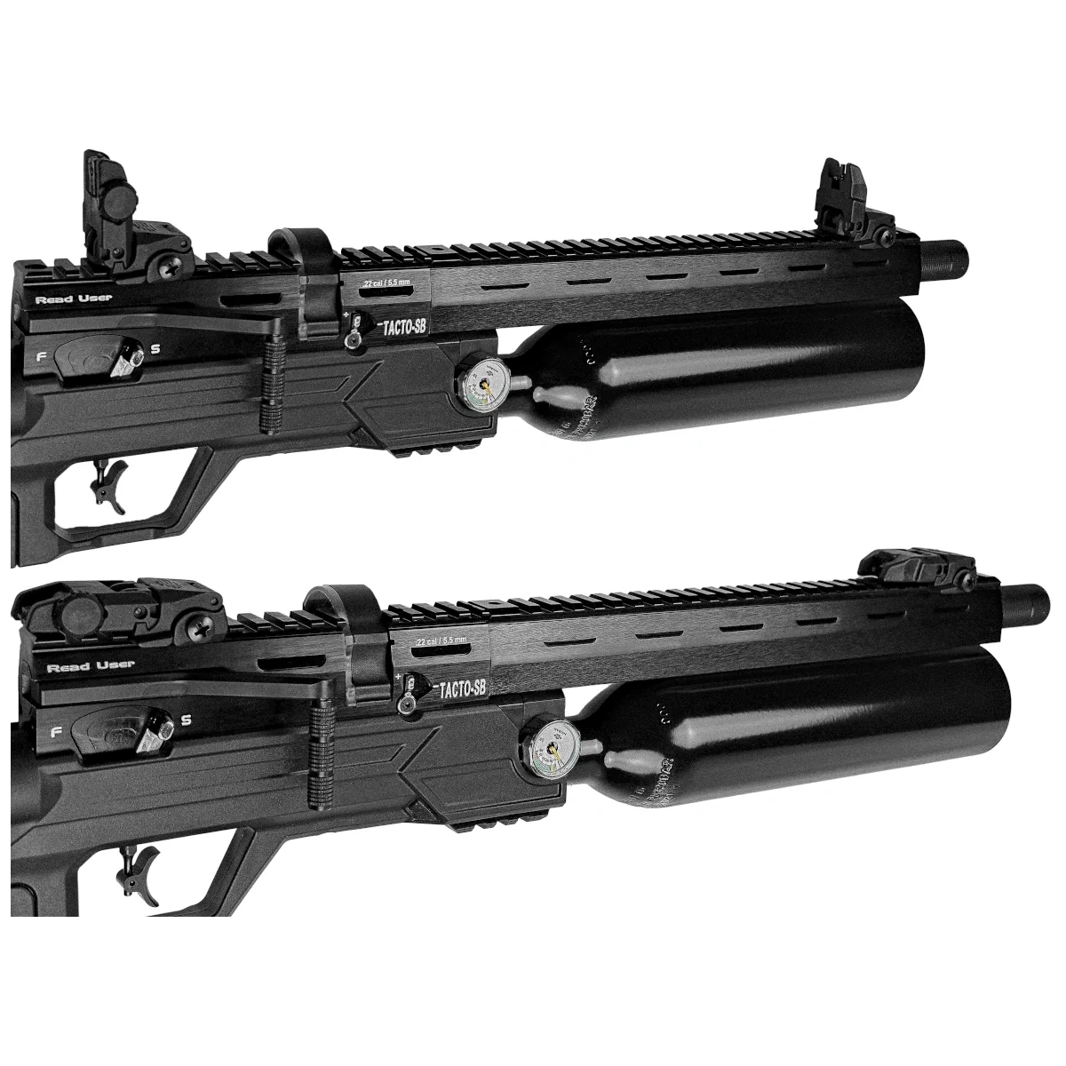 Tacto-SB posiada taktyczną osadę wykonaną z wytrzymałego polimeru z chwytem pistoletowym oraz teleskopową, składaną kolbą w systemie AR-15. Korpus zamka wiatrówki wykonany z lotniczego aluminium. Osłona lufy posiada przedłużenie szyny RIS/Picatinny 22mm na całej długości, co umożliwia bezproblemowy montaż celownika optycznego lub stałych przyrządów celowniczych (w zestawie).
