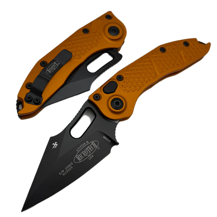 - Stitch-A S/E Orange Tangerine Aluminum, Black automatyczna wersja popularnego projektu Sebastijana Berenjiego z Borka Blades i firmy Microtech. Szerokie ostrze w kształcie harpuna, doskonałe materiały i legendarna jakość wykonania firmy Microtech!