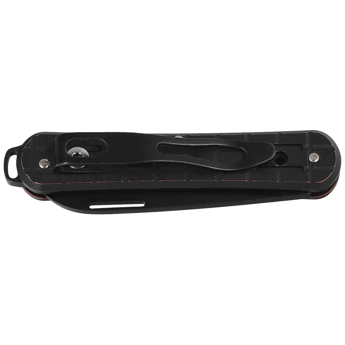 Rękojeść - okładziny wykonane z odpornej na działanie temperatur oraz uszkodzenia mechaniczne miedzi. Pokryta czarną powłoką PVD i przecierana na krawędziach, daje świetny efekt wizualny. Charakterystyczna faktura rękojeści imitująca powierzchnie granatu odłamkowego (Frag Pattern) oprócz walorów wizualnych powoduje, że nóż nie ślizga się w dłoni podczas używania. Prosty kształt świetnie dopasowuje się do każdej dłoni. Dwupozycyjny klips umożliwia przenoszenie noża w pozycji tip-up lub tip-down. W tylnej części szerokie "ucho" na przewleczenie linki asekuracyjnej lub ozdobnej.