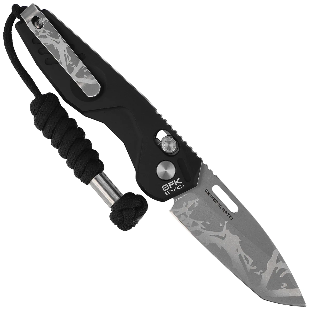 W centrum zestawu znajduje się folder BFK EVO LE, wyprodukowany w ilości zaledwie 500 sztuk. Nóż posiada indywidualny numer seryjny (tu: 289/500), a jego design oparto na rozpoznawalnej linii Basic Folder Knife. Głownia ze stali Nitrogen została wykończona metodą stonewashed z laserowym wzorem kamuflażu, co nadaje każdemu egzemplarzowi unikalny wygląd. Mechanizm Axis Lock zapewnia niezawodną blokadę i płynną pracę ostrza, a anodyzowane okładziny z aluminium gwarantują trwałość i wygodę użytkowania. Całość uzupełnia klips deep carry i paracord z metalowym zakończeniem.