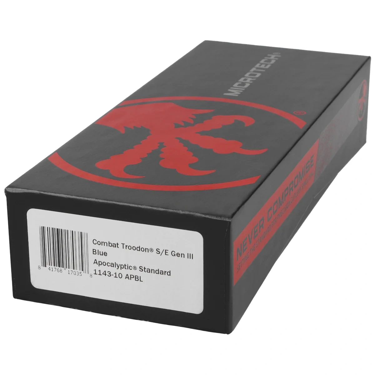 Combat Troodon Gen III S/E Blue Aluminium, Apocalyptic ten największy z noży automatycznych, to szczyt precyzyjnej inżynierii i taktycznej sprawności w dziedzinie noży OTF (Out The Front). Zbudowany z myślą o szerokim spektrum zastosowań użytkowych, może pochwalić się większym o 25% rozmiarem w porównaniu do flagowego Troodona. Precyzyjnie wykonany, wyposażony w wyrafinowany i piekielnie szybki mechanizm wysuwający ostre jak brzytwa ostrze. W 100% wyprodukowany i zmontowany w USA. Projekt Anthony'ego Marfione, knifemakera i właściciela Microtech Knives.