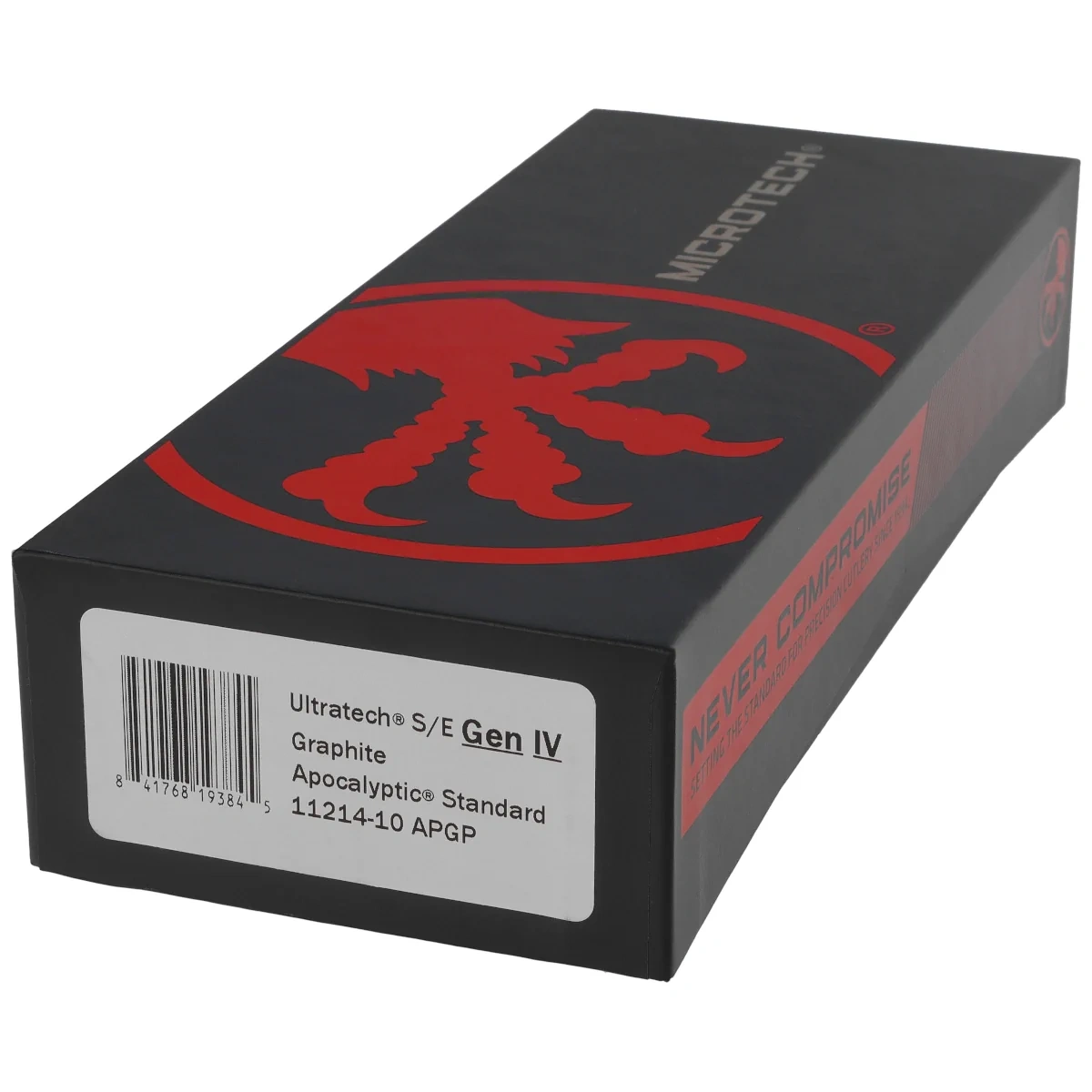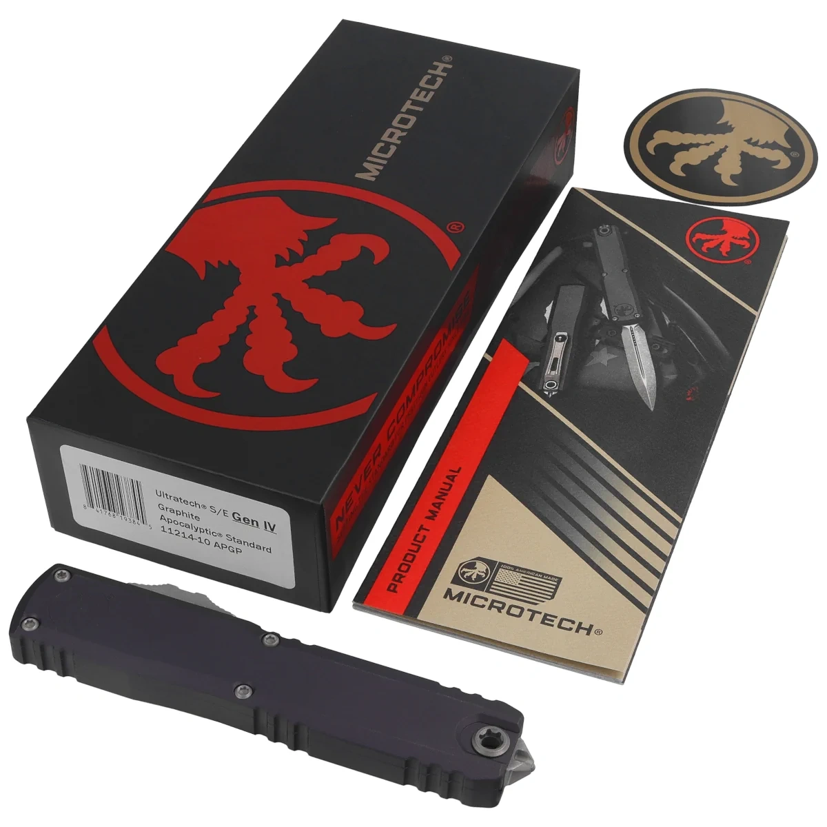 Ultratech Gen IV S/E Graphite Aluminium, Apocalyptic to pełnowymiarowy nóż automatyczny OTF (Out The Front) z serii Ultratech. Czwarta generacja wyróżnia się szeregiem usprawnień, takich jak; Crud Kutter™, Dual-Fuel Drive Train™. Przeprojektowano również rękojeść, wyposażając ją w rozwiązania znane z innych modeli. Pracujący w trybie D/A (Double Action), umożliwia błyskawiczne wysunięcie i schowanie ostrza za pomocą jednego ruchu kciuka. Projekt autorstwa Tony’ego Marfione, właściciela Microtech Knives, łączy w sobie nowoczesny design z najwyższą jakością wykonania.