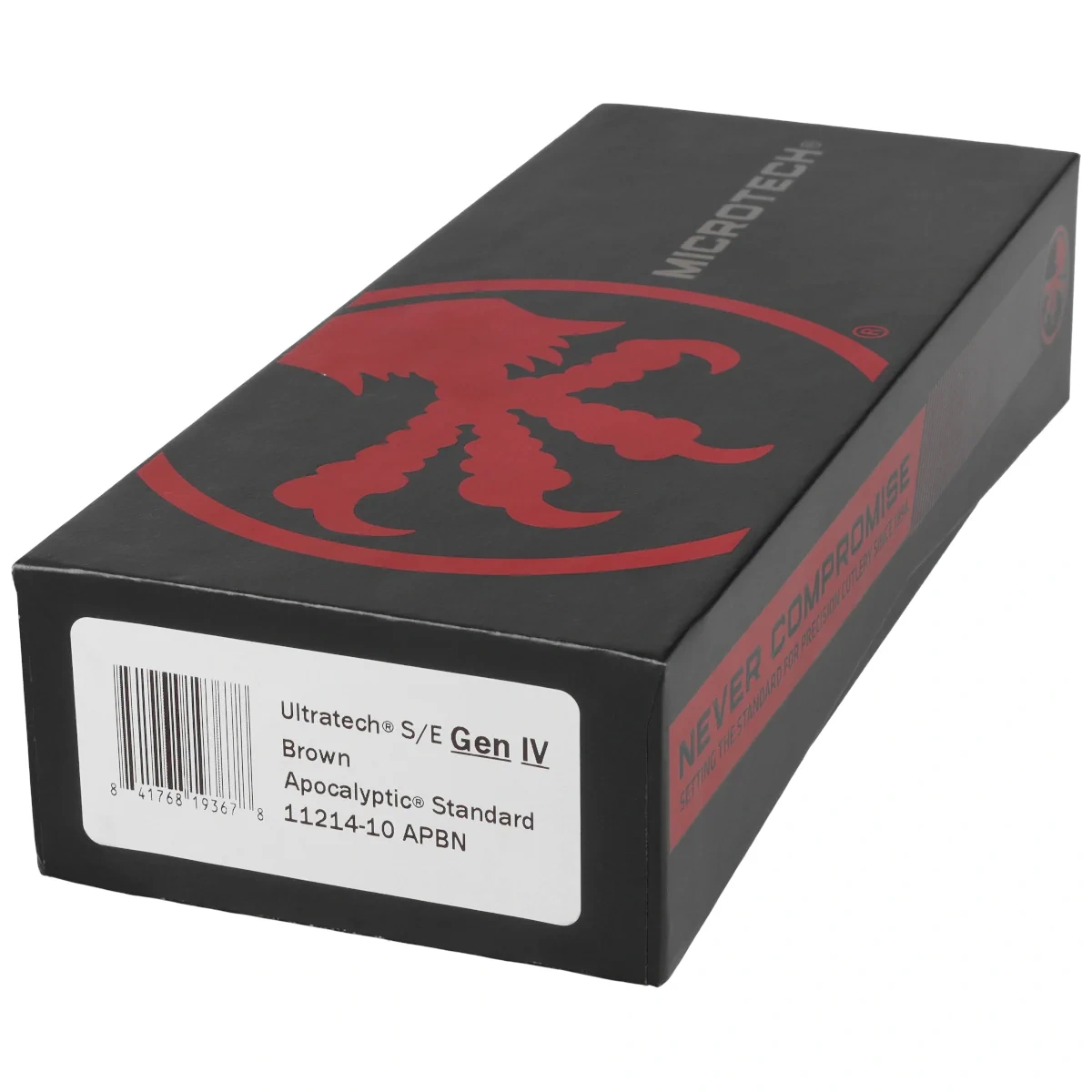 Ultratech Gen IV S/E Brown Aluminium, Apocalyptic to pełnowymiarowy nóż automatyczny OTF (Out The Front) z serii Ultratech. Czwarta generacja wyróżnia się szeregiem usprawnień, takich jak; Crud Kutter™, Dual-Fuel Drive Train™. Przeprojektowano również rękojeść, wyposażając ją w rozwiązania znane z innych modeli. Pracujący w trybie D/A (Double Action), umożliwia błyskawiczne wysunięcie i schowanie ostrza za pomocą jednego ruchu kciuka. Projekt autorstwa Tony’ego Marfione, właściciela Microtech Knives, łączy w sobie nowoczesny design z najwyższą jakością wykonania.