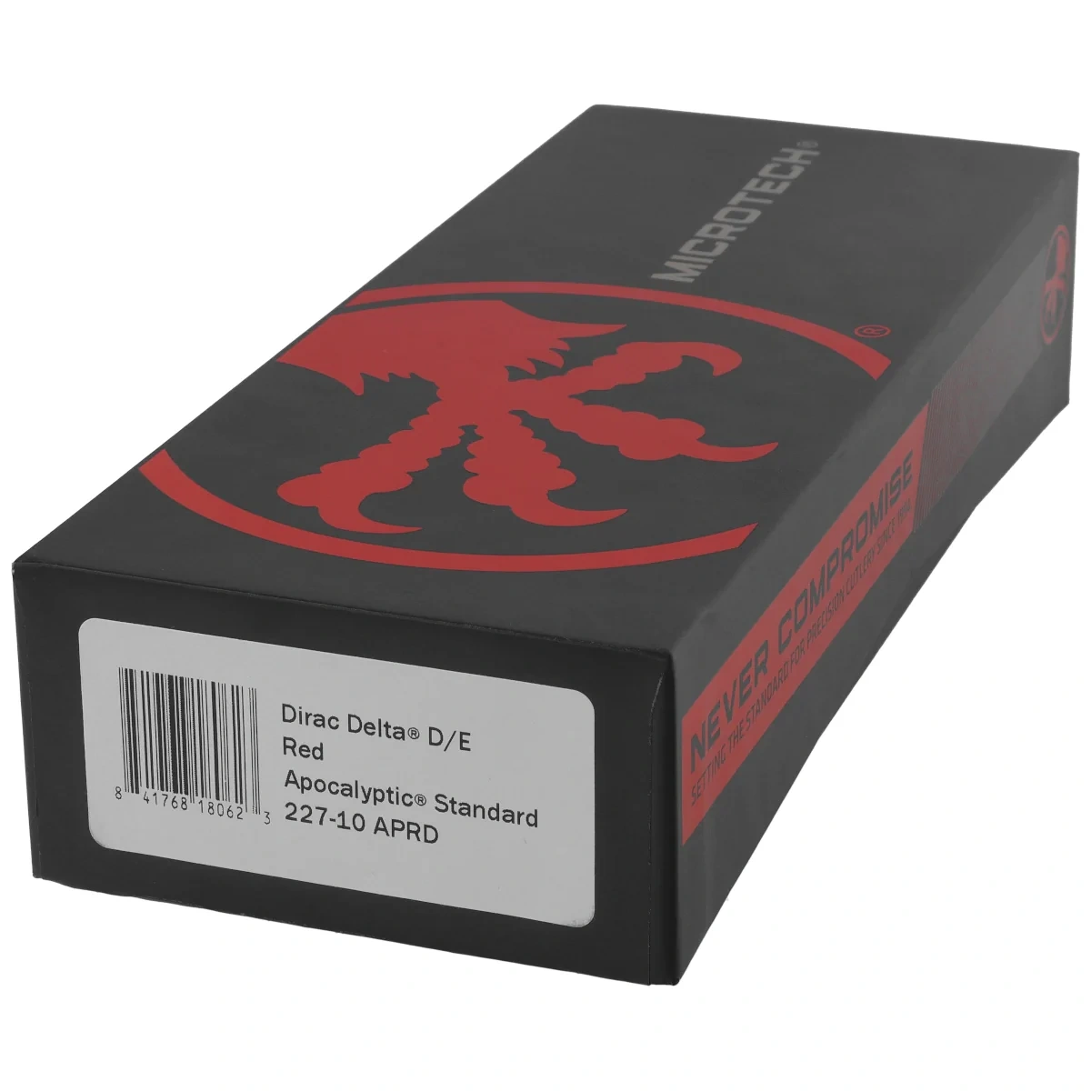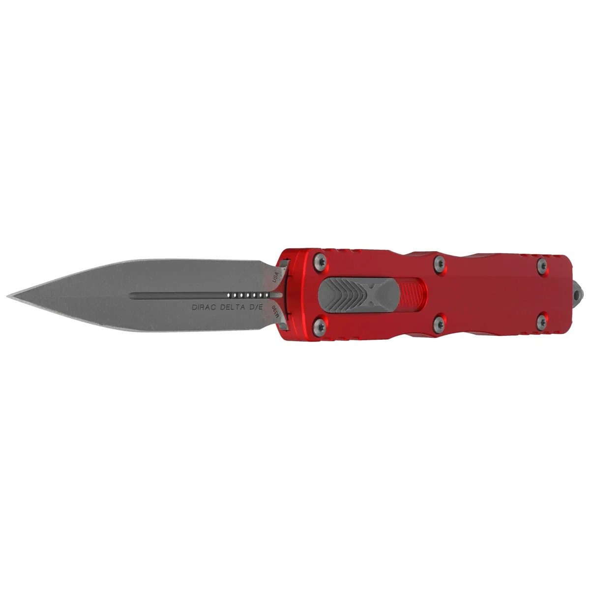 - Dirac Delta D/E Red Aluminum, Apocalyptic większa wersja noża automatycznego OTF z serii Dirac. Pracujący w trybie D/A, wyposażony w szybki mechanizm wysuwający ostrze. Przycisk slidera na boku rękojeści. Projekt Tony Marfione, Microtech Knives